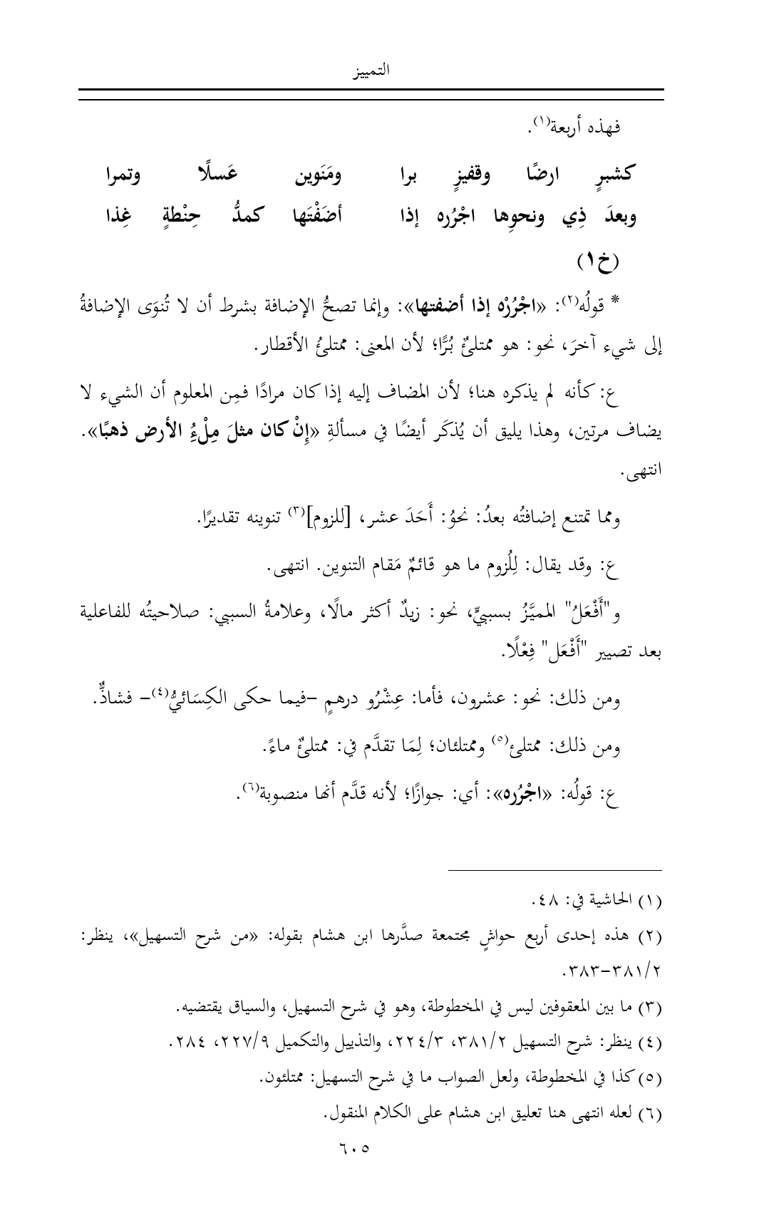 (¬٢) هذه إحدى أربع حواشٍ مجتمعة صدَّرها ابن هشام بقوله: «من شرح التسهيل»، ينظر: ٢/ ٣٨١ - ٣٨٣.