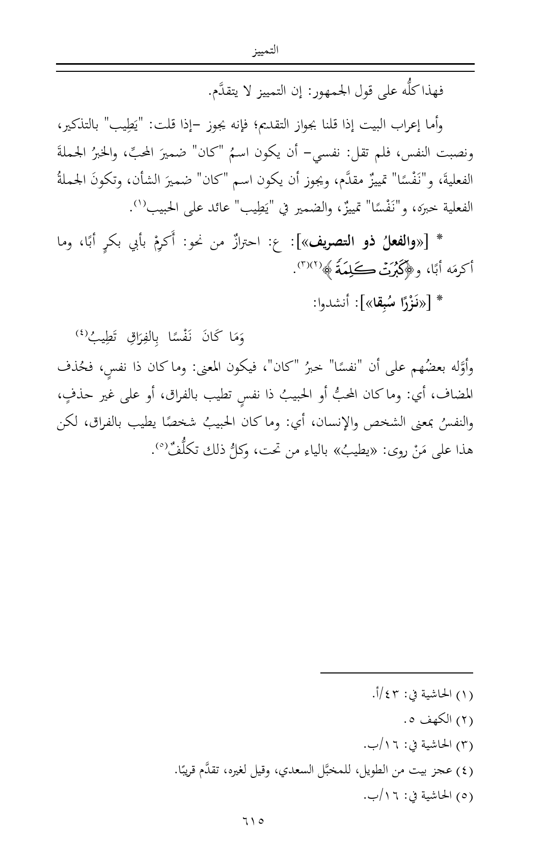 وأما إعراب البيت إذا قلنا بجواز التقديم؛ فإنه يجوز -إذا قلت: "يَطِيب" بالتذكير، ونصبت النفس، فلم تقل: نفسي- أن يكون اسمُ "كان" ضميرَ المحبِّ، والخبرُ الجملةَ الفعليةَ، و"نَفْسًا" تمييزٌ مقدَّم، ويجوز أن يكون اسم "كان" ضميرَ الشأن، وتكونَ الجملةُ الفعلية خبرَه، و"نَفْسًا" تمييزٌ، والضمير في "يَطِيب" عائد على الحبيب (¬١).