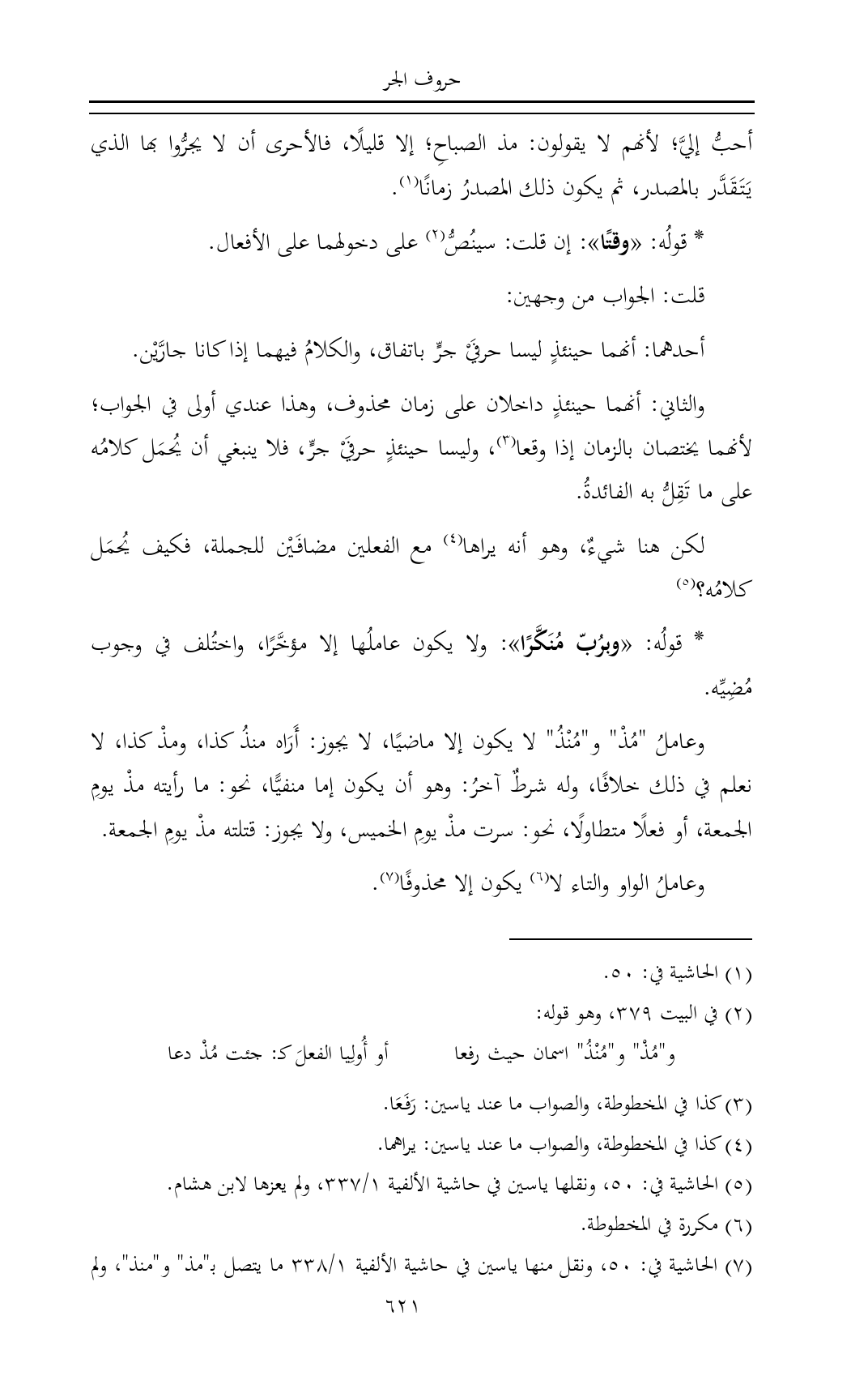 (¬٧) الحاشية في: ٥٠، ونقل منها ياسين في حاشية الألفية ١/ ٣٣٨ ما يتصل بـ"مذ" و"منذ"، ولم يعزه لابن هشام.