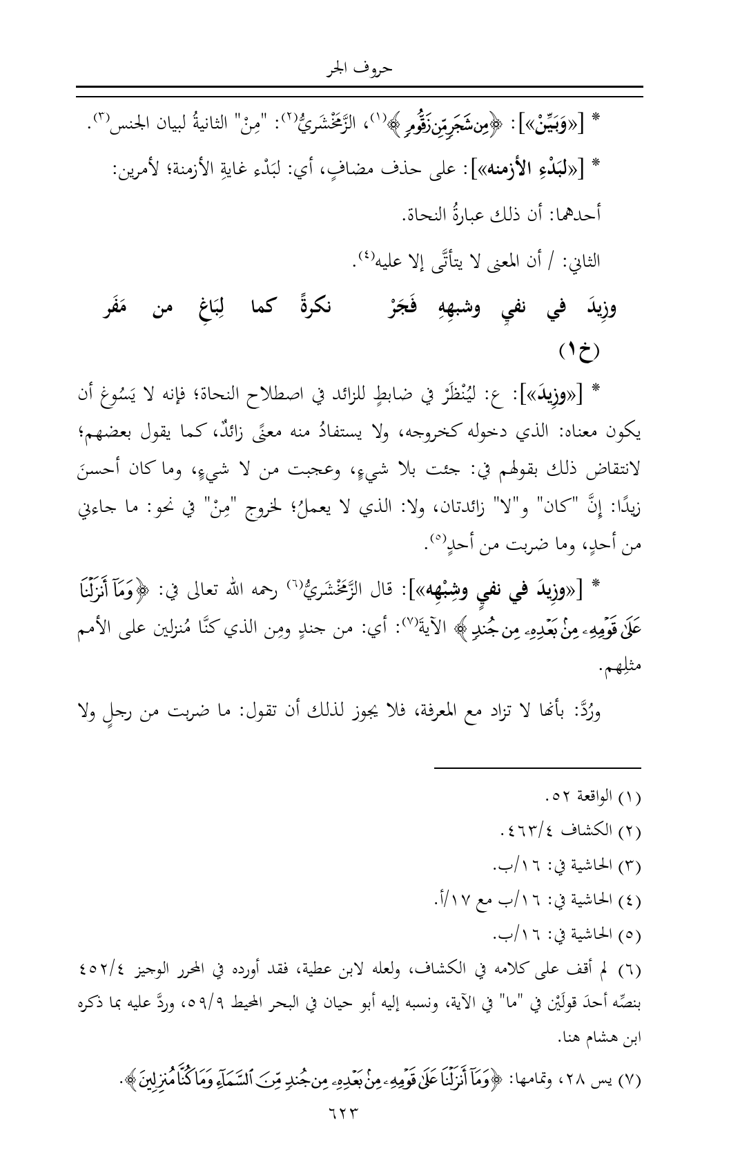 * [«وزِيدَ في نفيٍ وشِبْهِه»]: قال الزَّمَخْشَريُّ (¬٦) رحمه الله تعالى في: {وَمَا أَنْزَلْنَا عَلَى قَوْمِهِ مِنْ بَعْدِهِ مِنْ جُنْدٍ} الآيةَ (¬٧): أي: من جندٍ ومِن الذي كنَّا مُنزلين على الأمم مثلِهم.
