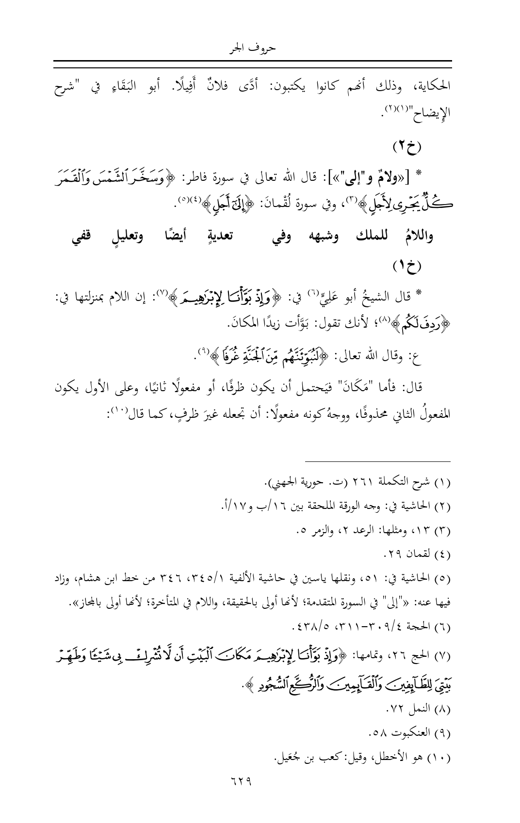 (¬٥) الحاشية في: ٥١، ونقلها ياسين في حاشية الألفية ١/ ٣٤٥، ٣٤٦ من خط ابن هشام، وزاد فيها عنه: «"إلى" في السورة المتقدمة؛ لأنها أولى بالحقيقة، واللام في المتأخرة؛ لأنها أولى بالمجاز».