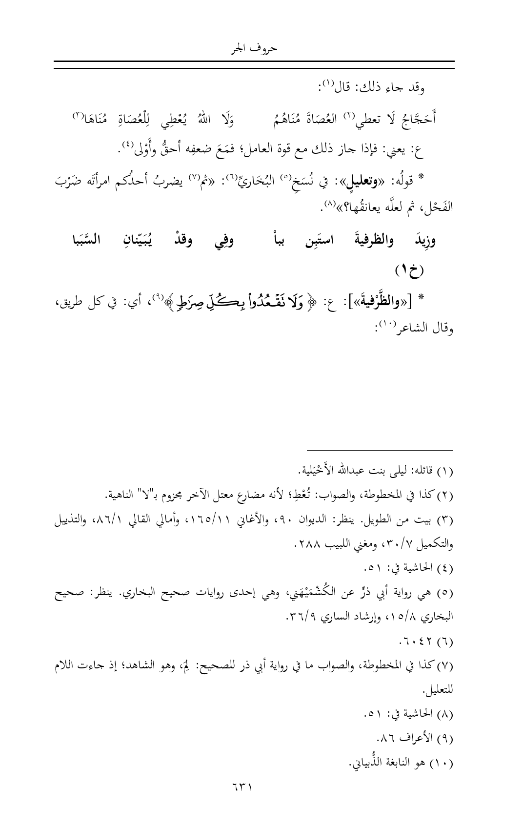 * [«والظَّرْفيةَ»]: ع: {وَلَا تَقْعُدُوا بِكُلِّ صِرَاطٍ} (¬٩)، أي: في كل طريق، وقال الشاعر (¬١٠):