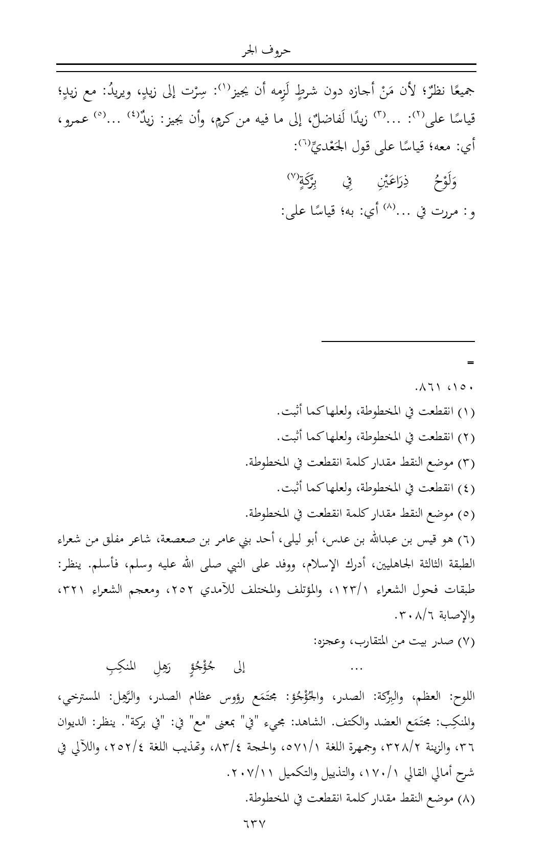 جميعًا نظرٌ؛ لأن مَنْ أجازه دون شرطٍ لَزِمه أن يجيز (¬١): سِرْت إلى زيدٍ، ويريدُ: مع زيدٍ؛ قياسًا على (¬٢): ... (¬٣) زيدًا لَفاضلٌ، إلى ما فيه من كرمٍ، وأن يجيز: زيدٌ (¬٤) ... (¬٥) عمرو، أي: معه؛ قياسًا على قول الجَعْديِّ (¬٦):
