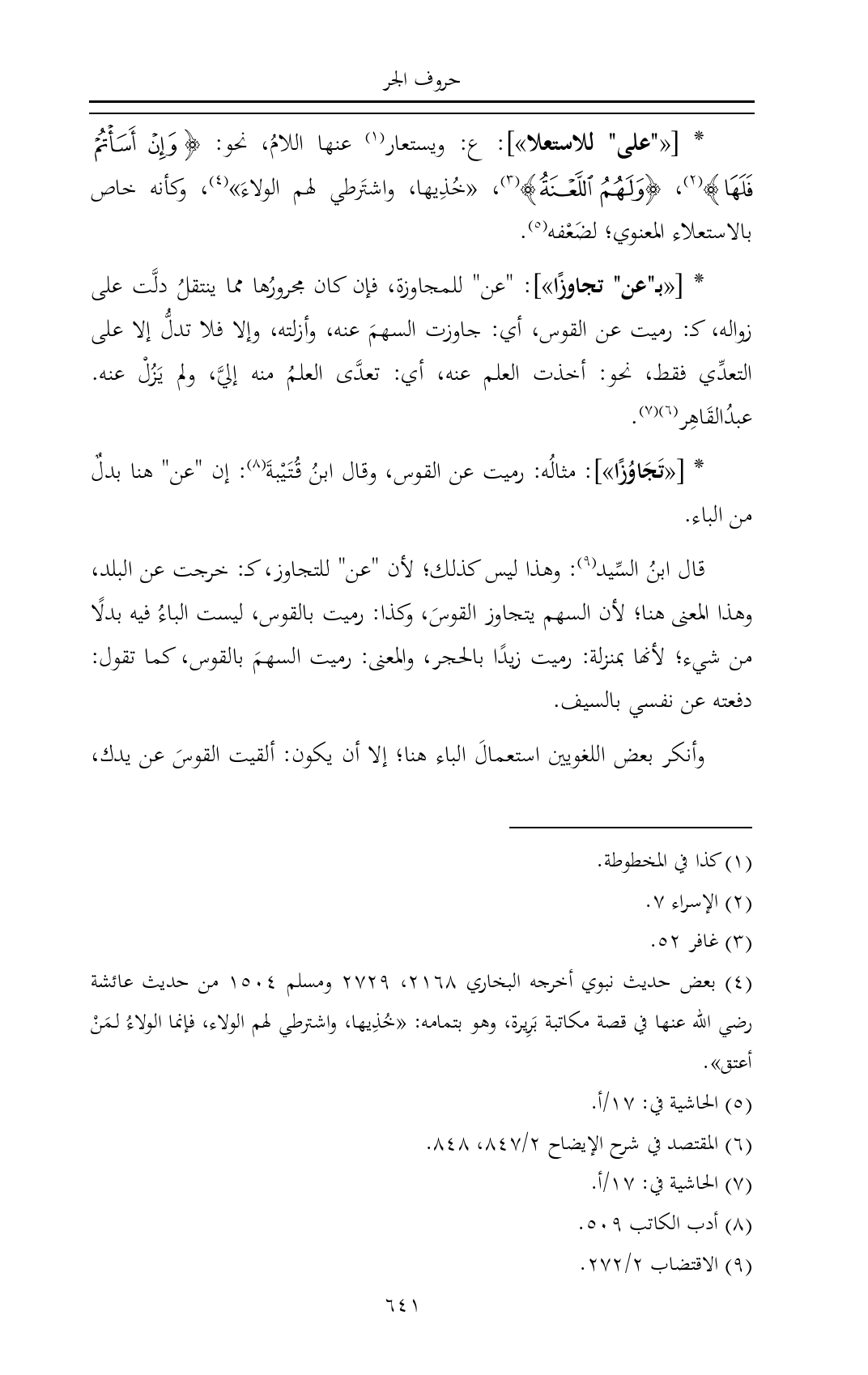 * [«تَجَاوُزًا»]: مثالُه: رميت عن القوس، وقال ابنُ قُتَيْبةَ (¬٨): إن "عن" هنا بدلٌ من الباء.
