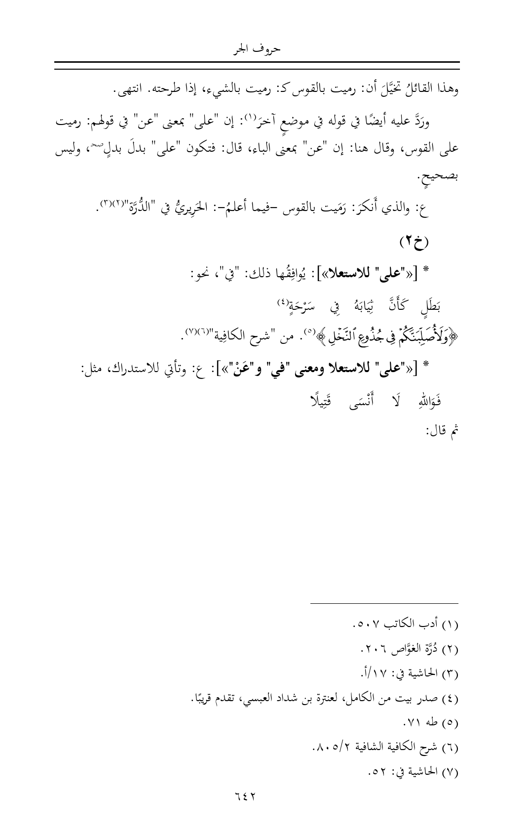 * [«"على" للاستعلا»]: يُوافِقُها ذلك: "في"، نحو: