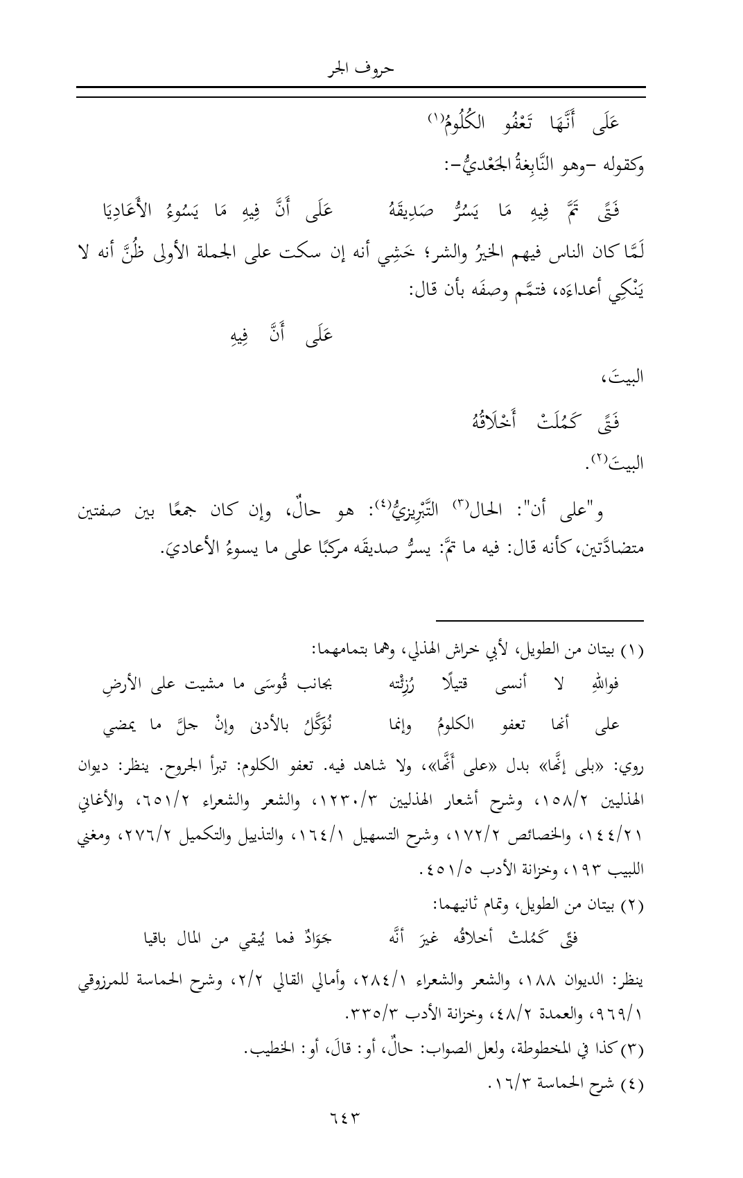 روي: «بلى إنَّها» بدل «على أَنَّها»، ولا شاهد فيه. تعفو الكلوم: تبرأ الجروح. ينظر: ديوان الهذليين ٢/ ١٥٨، وشرح أشعار الهذليين ٣/ ١٢٣٠، والشعر والشعراء ٢/ ٦٥١، والأغاني ٢١/ ١٤٤، والخصائص ٢/ ١٧٢، وشرح التسهيل ١/ ١٦٤، والتذييل والتكميل ٢/ ٢٧٦، ومغني اللبيب ١٩٣، وخزانة الأدب ٥/ ٤٥١.