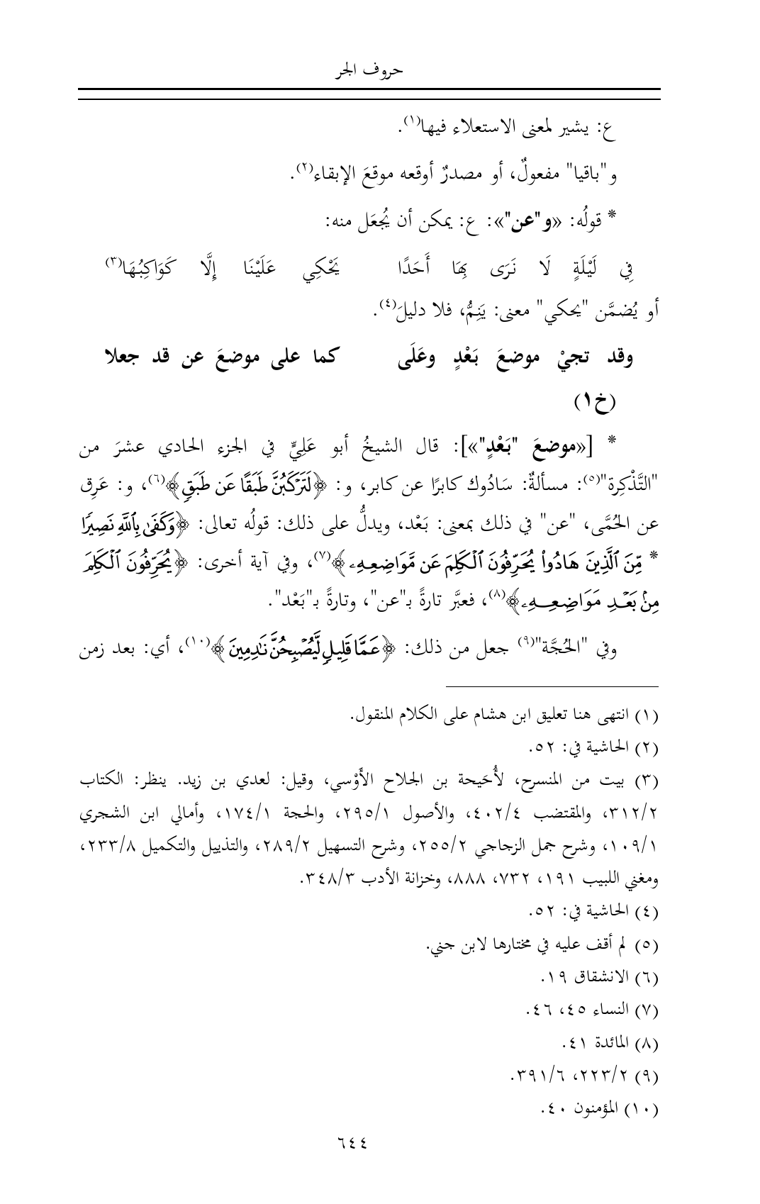 * [«موضعَ "بَعْدٍ"»]: قال الشيخُ أبو عَلِيٍّ في الجزء الحادي عشرَ من "التَّذْكِرة" (¬٥): مسألةٌ: سَادُوك كابرًا عن كابر، و: {لَتَرْكَبُنَّ طَبَقًا عَنْ طَبَقٍ} (¬٦)، و: عَرِق عن الحُمَّى، "عن" في ذلك بمعنى: بَعْد، ويدلُّ على ذلك: قولُه تعالى: {وَكَفَى بِاللَّهِ نَصِيرًا * مِنَ الَّذِينَ هَادُوا يُحَرِّفُونَ الْكَلِمَ عَنْ مَوَاضِعِهِ} (¬٧)، وفي آية أخرى: {يُحَرِّفُونَ الْكَلِمَ مِنْ بَعْدِ مَوَاضِعِهِ} (¬٨)، فعبَّر تارةً بـ"عن"، وتارةً بـ"بَعْد".