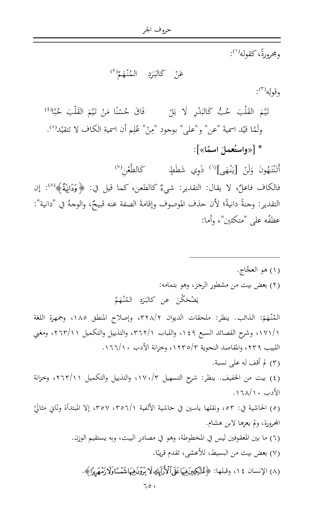 (¬٥) الحاشية في: ٥٣، ونقلها ياسين في حاشية الألفية ١/ ٣٥٦، ٣٥٧، إلا المبتدأة وثاني مثالَيْ المجرورة، ولم يعزها لابن هشام.