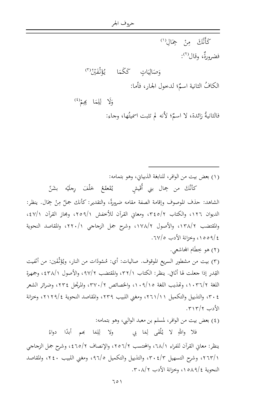 (¬٣) بيت من مشطور السريع الموقوف. صاليات: أي: مُسْودّات من النار، ويُؤَثْفَين: من أثفيت القِدر إذا جعلت لها أثافي. ينظر: الكتاب ١/ ٣٢، والمقتضب ٢/ ٩٧، والأصول ١/ ٤٣٨، وجمهرة اللغة ٢/ ١٠٣٦، وتهذيب اللغة ١٥/ ١٠٩، والخصائص ٢/ ٣٧٠، والمرتجل ٢٣٤، وضرائر الشعر ٣٠٤، والتذييل والتكميل ١١/ ٢٦١، ومغني اللبيب ٢٣٩، والمقاصد النحوية ٤/ ٢١٢٩، وخزانة الأدب ٢/ ٣١٣.