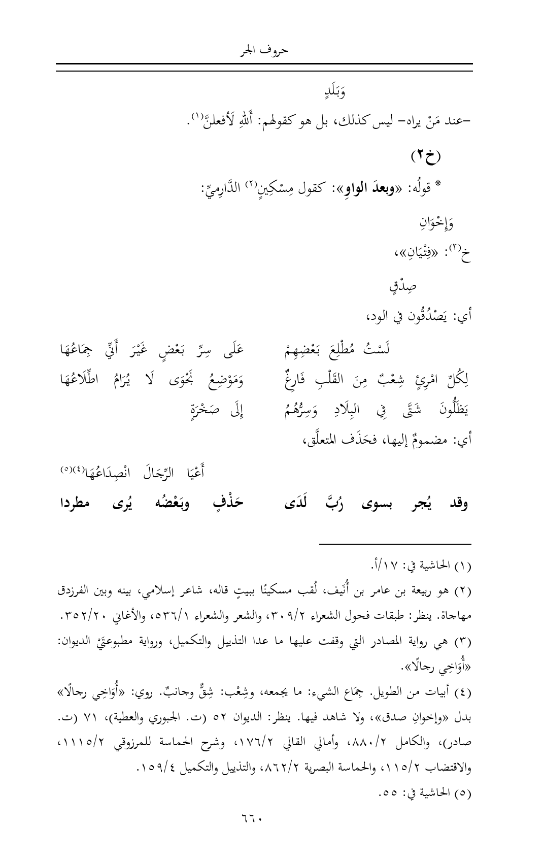* قولُه: «وبعدَ الواوِ»: كقول مِسْكِينٍ (¬٢) الدَّارِميِّ: