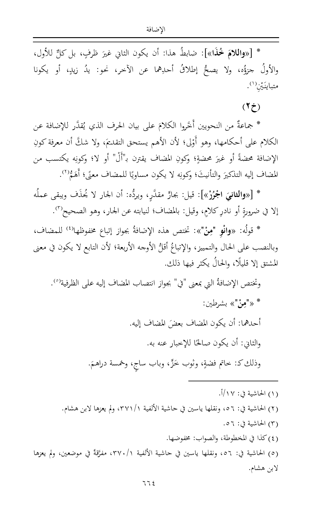 (¬٥) الحاشية في: ٥٦، ونقلها ياسين في حاشية الألفية ١/ ٣٧٠، مفرَّقةً في موضعين، ولم يعزها لابن هشام.