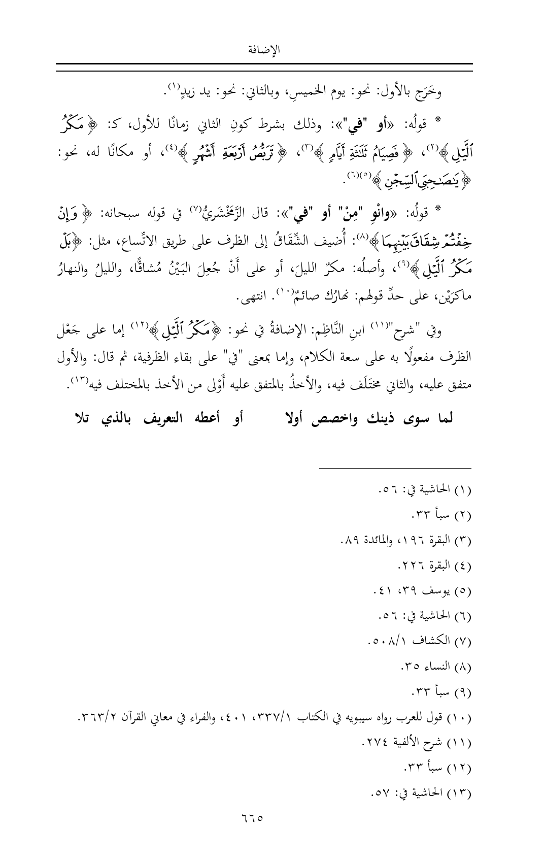 * قولُه: «أو "في"»: وذلك بشرط كونِ الثاني زمانًا للأول، كـ: {مَكْرُ اللَّيْلِ} (¬٢)، {فَصِيَامُ ثَلَاثَةِ أَيَّامٍ} (¬٣)، {تَرَبُّصُ أَرْبَعَةِ أَشْهُرٍ} (¬٤)، أو مكانًا له، نحو: {يَاصَاحِبَيِ السِّجْنِ} (¬٥) (¬٦).