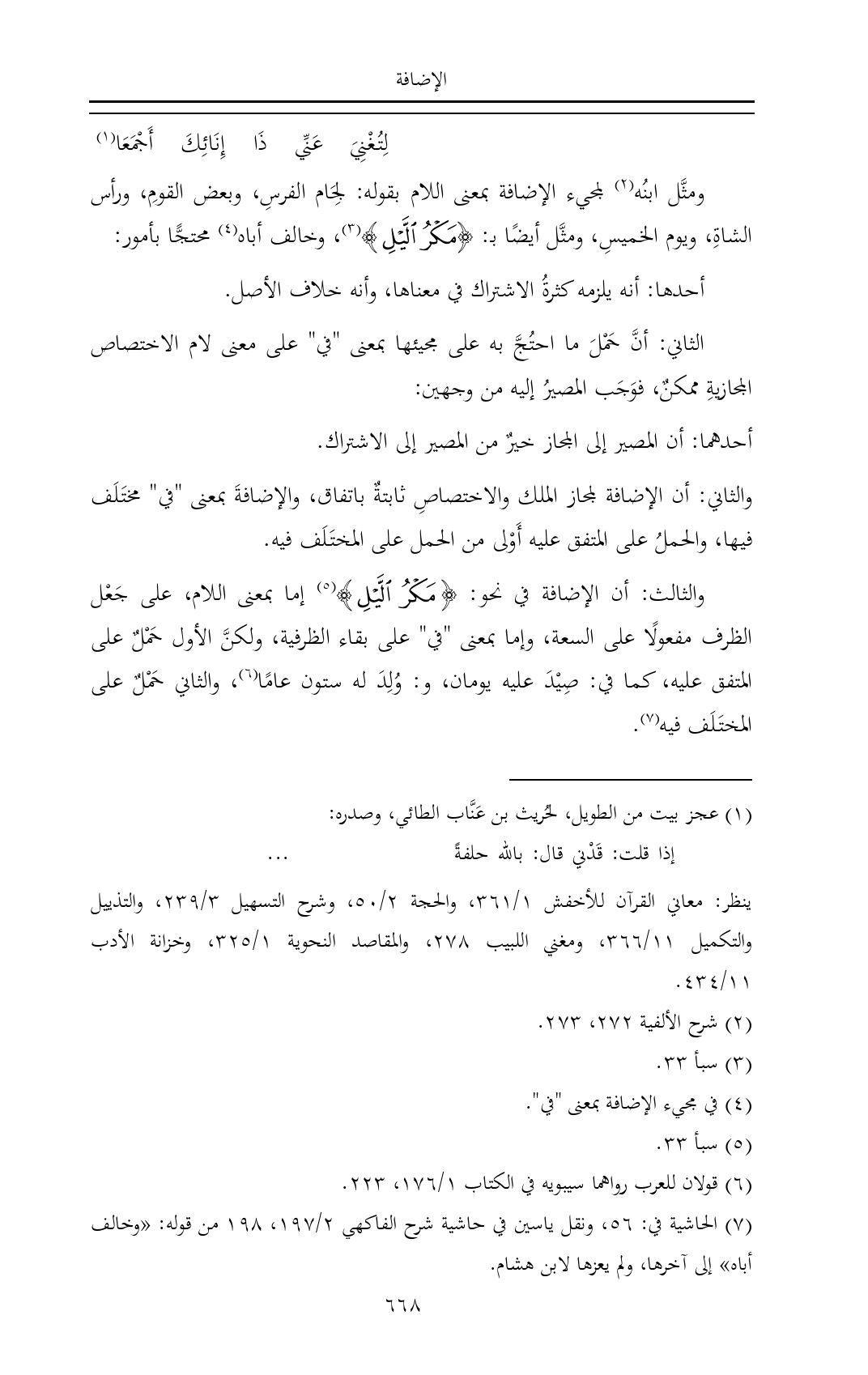 والثالث: أن الإضافة في نحو: {مَكْرُ اللَّيْلِ} (¬٥) إما بمعنى اللام، على جَعْل الظرف مفعولًا على السعة، وإما بمعنى "في" على بقاء الظرفية، ولكنَّ الأول حَمْلٌ على المتفق عليه، كما في: صِيْدَ عليه يومان، و: وُلِدَ له ستون عامًا (¬٦)، والثاني حَمْلٌ على المختَلَف فيه (¬٧).