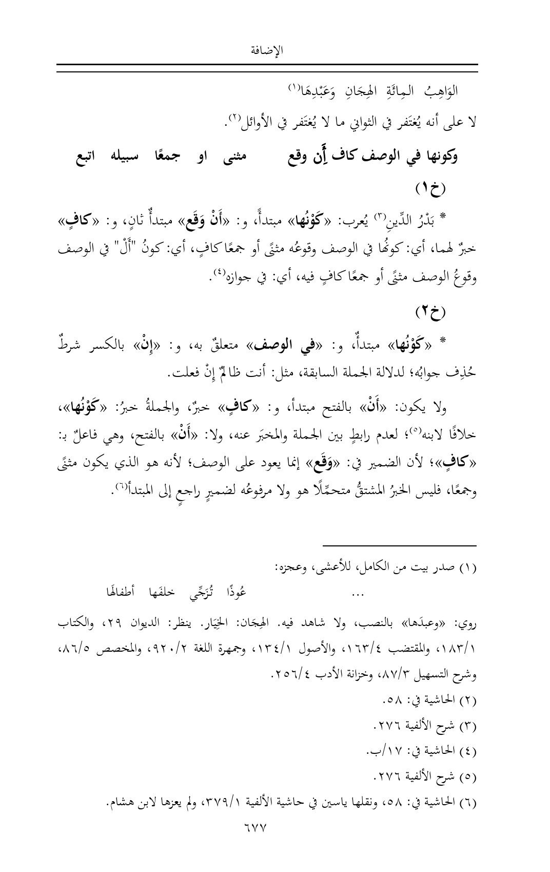 * بَدْرُ الدِّينِ (¬٣) يُعرب: «كَوْنُها» مبتدأً، و: «أَنْ وَقَع» مبتدأٌ ثانٍ، و: «كافٍ» خبرٌ لهما، أي: كونُها في الوصف وقوعُه مثنًى أو جمعًا كافٍ، أي: كونُ "أَلْ" في الوصف وقوعُ الوصف مثنًى أو جمعًا كافٍ فيه، أي: في جوازه (¬٤).