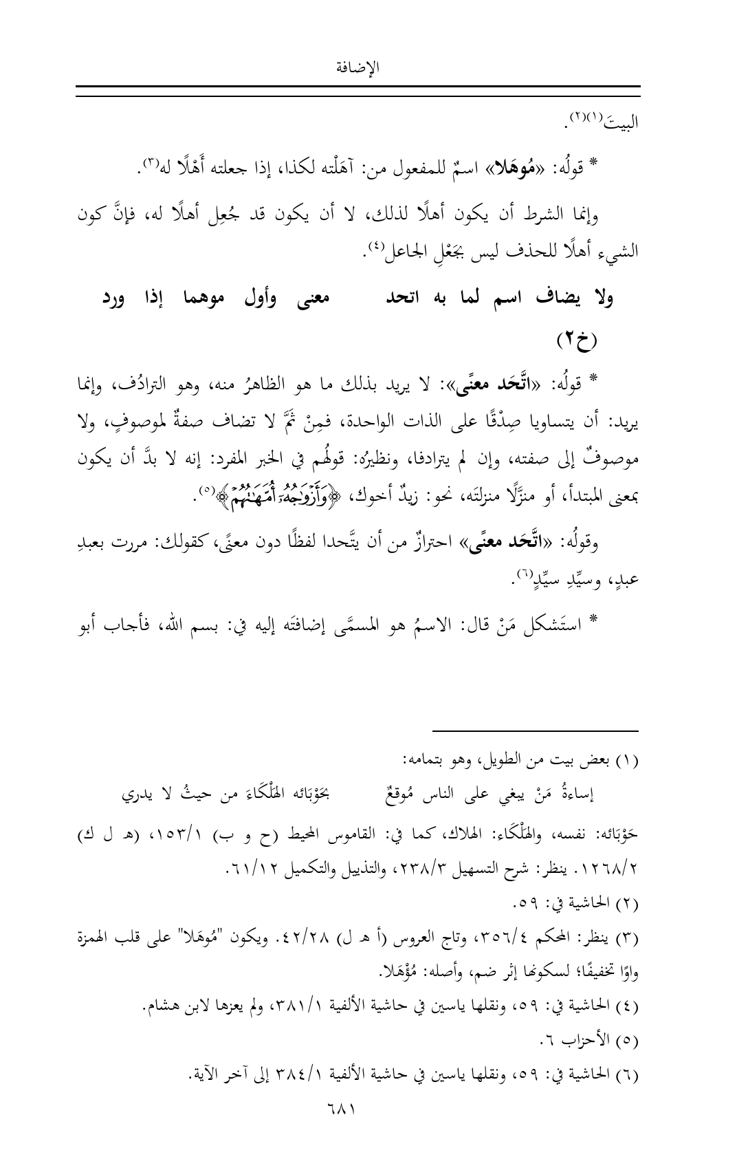(¬٣) ينظر: المحكم ٤/ ٣٥٦، وتاج العروس (أ هـ ل) ٢٨/ ٤٢. ويكون "مُوهَلا" على قلب الهمزة واوًا تخفيفًا؛ لسكونها إثر ضم، وأصله: مُؤْهَلا.