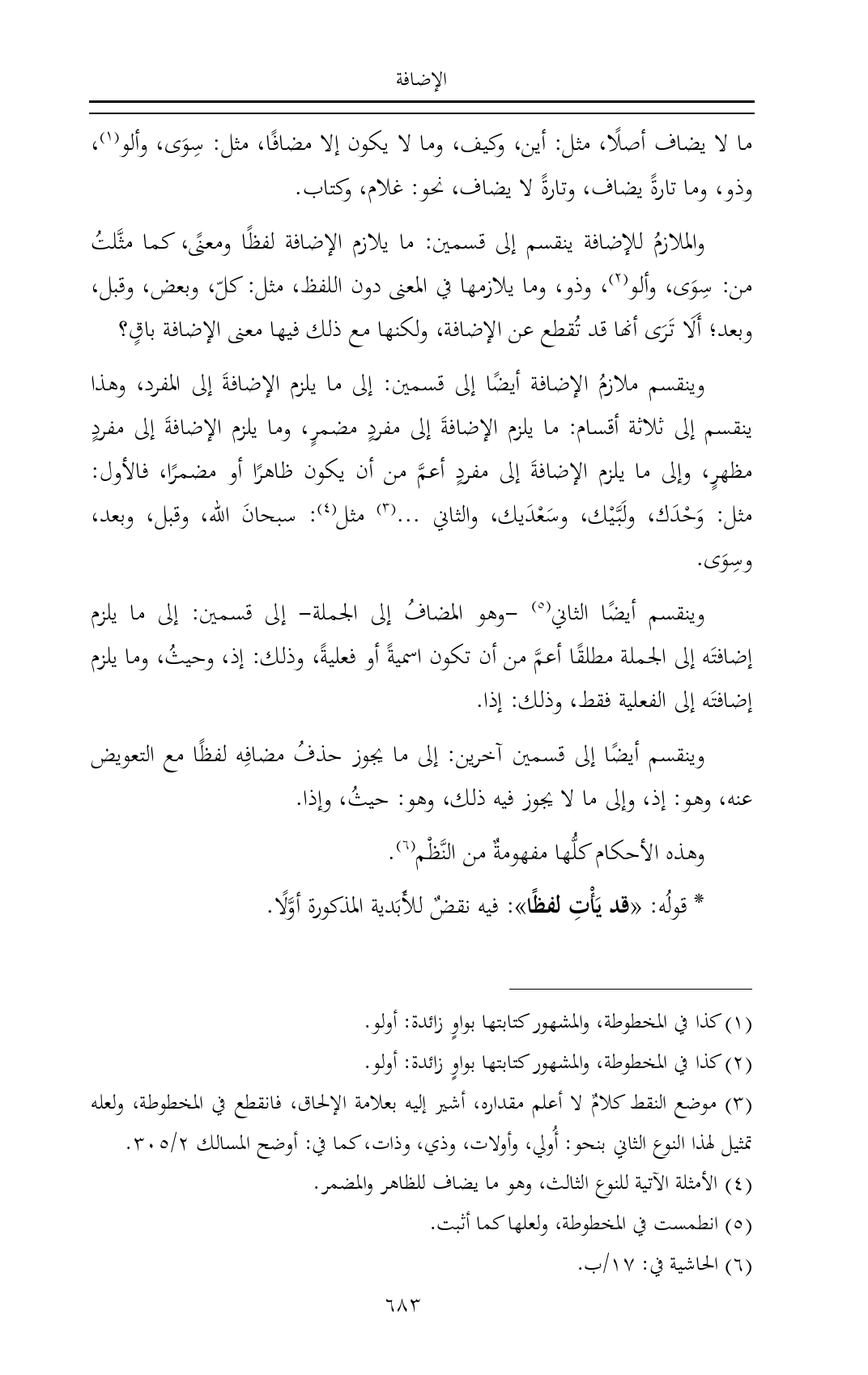 (¬٣) موضع النقط كلامٌ لا أعلم مقداره، أشير إليه بعلامة الإلحاق، فانقطع في المخطوطة، ولعله تمثيل لهذا النوع الثاني بنحو: أُولي، وأولات، وذي، وذات، كما في: أوضح المسالك ٢/ ٣٠٥.