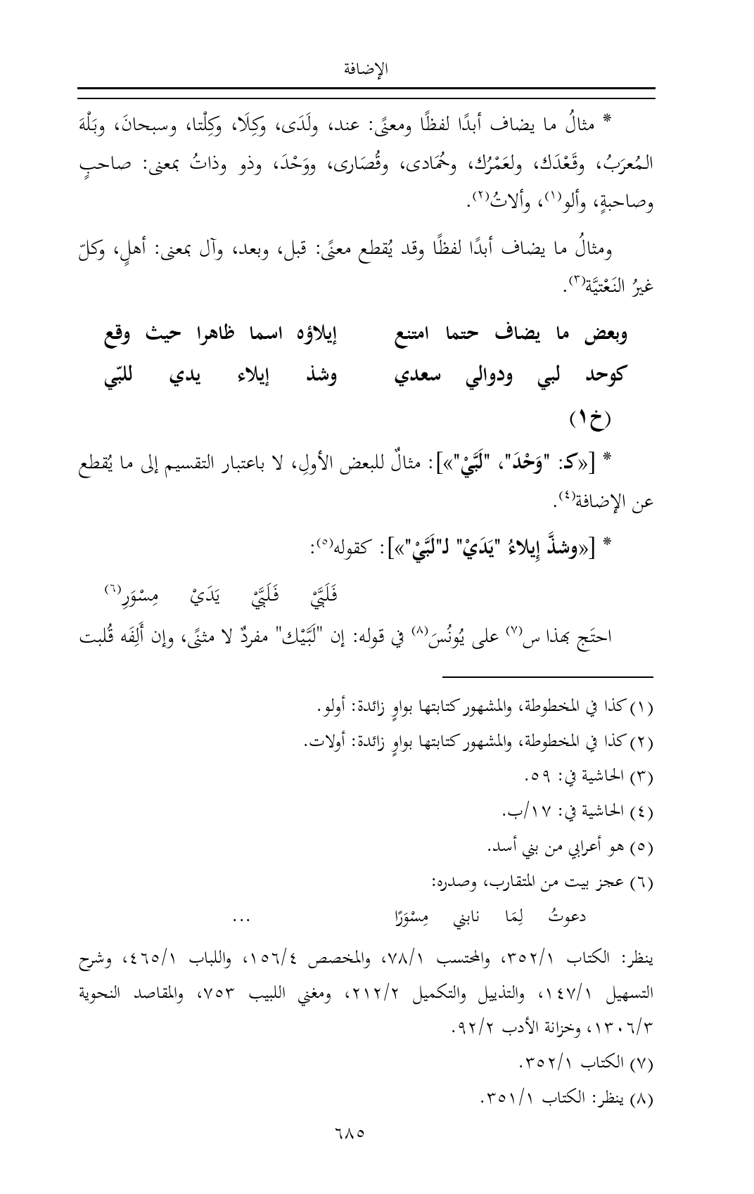 * [«كـ: "وَحْدَ"، "لَبَّيْ"»]: مثالٌ للبعض الأولِ، لا باعتبار التقسيم إلى ما يُقطع عن الإضافة (¬٤).