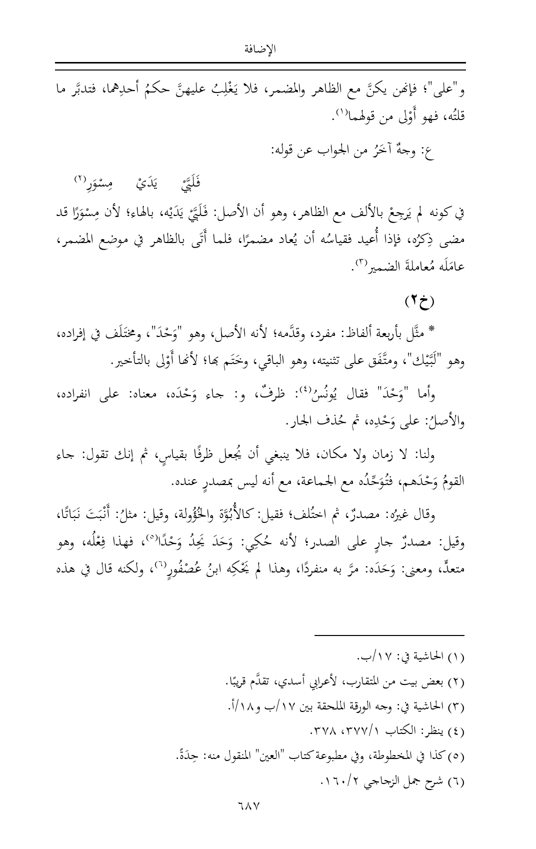 في كونه لم يَرجِعْ بالألف مع الظاهر، وهو أن الأصل: فَلَبَّيْ يَدَيْه، بالهاء؛ لأن مِسْوَرًا قد مضى ذِكرُه، فإذا أُعيد فقياسُه أن يُعاد مضمرًا، فلما أَتَى بالظاهر في موضع المضمر، عامَلَه مُعاملةَ الضمير (¬٣).