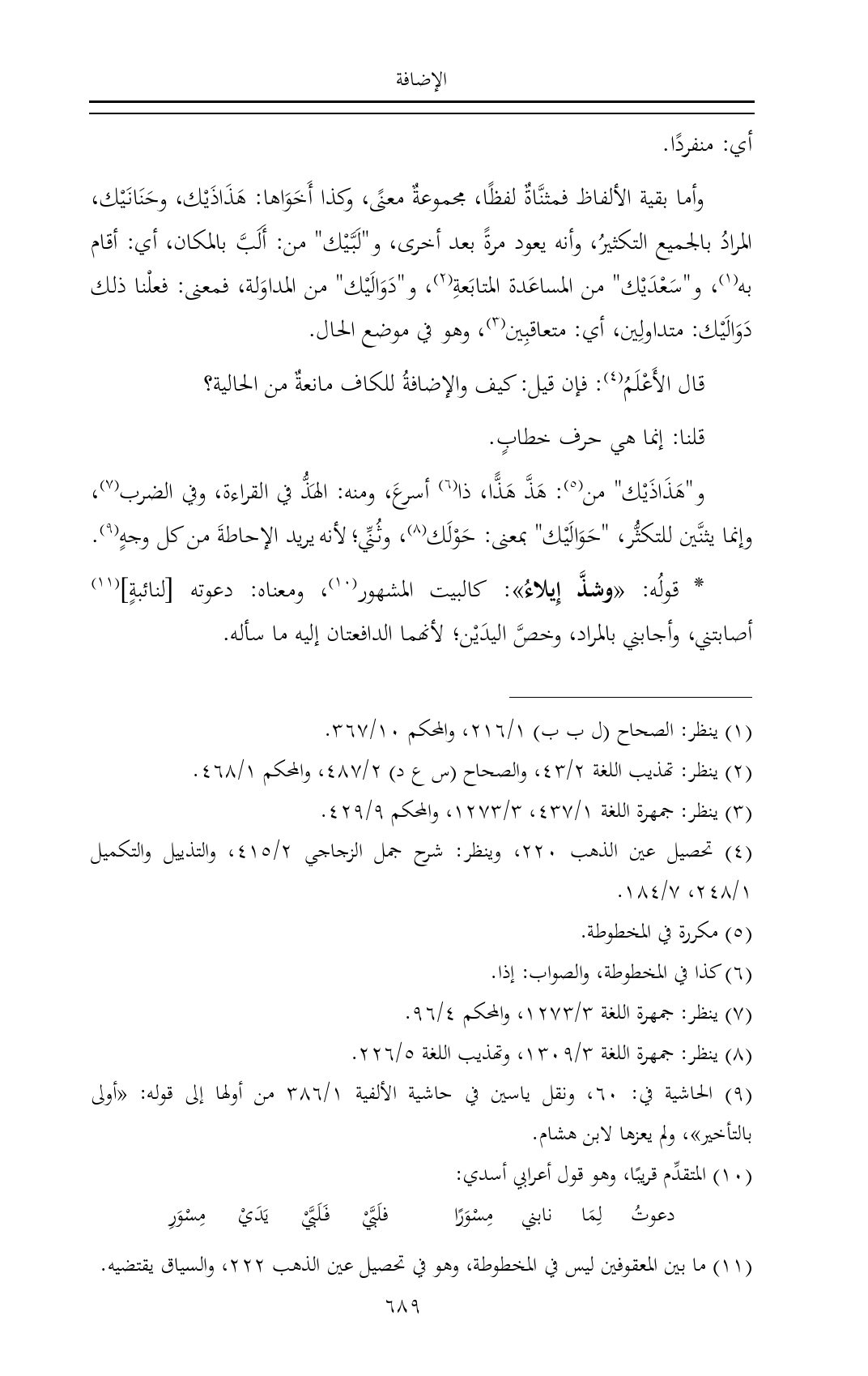 و"هَذَاذَيْك" من (¬٥): هَذَّ هَذًّا، ذا (¬٦) أسرعَ، ومنه: الهَذُّ في القراءة، وفي الضرب (¬٧)، وإنما يثنَّين للتكثُّر، "حَوَالَيْك" بمعنى: حَوْلَك (¬٨)، وثُنِّي؛ لأنه يريد الإحاطةَ من كل وجهٍ (¬٩).