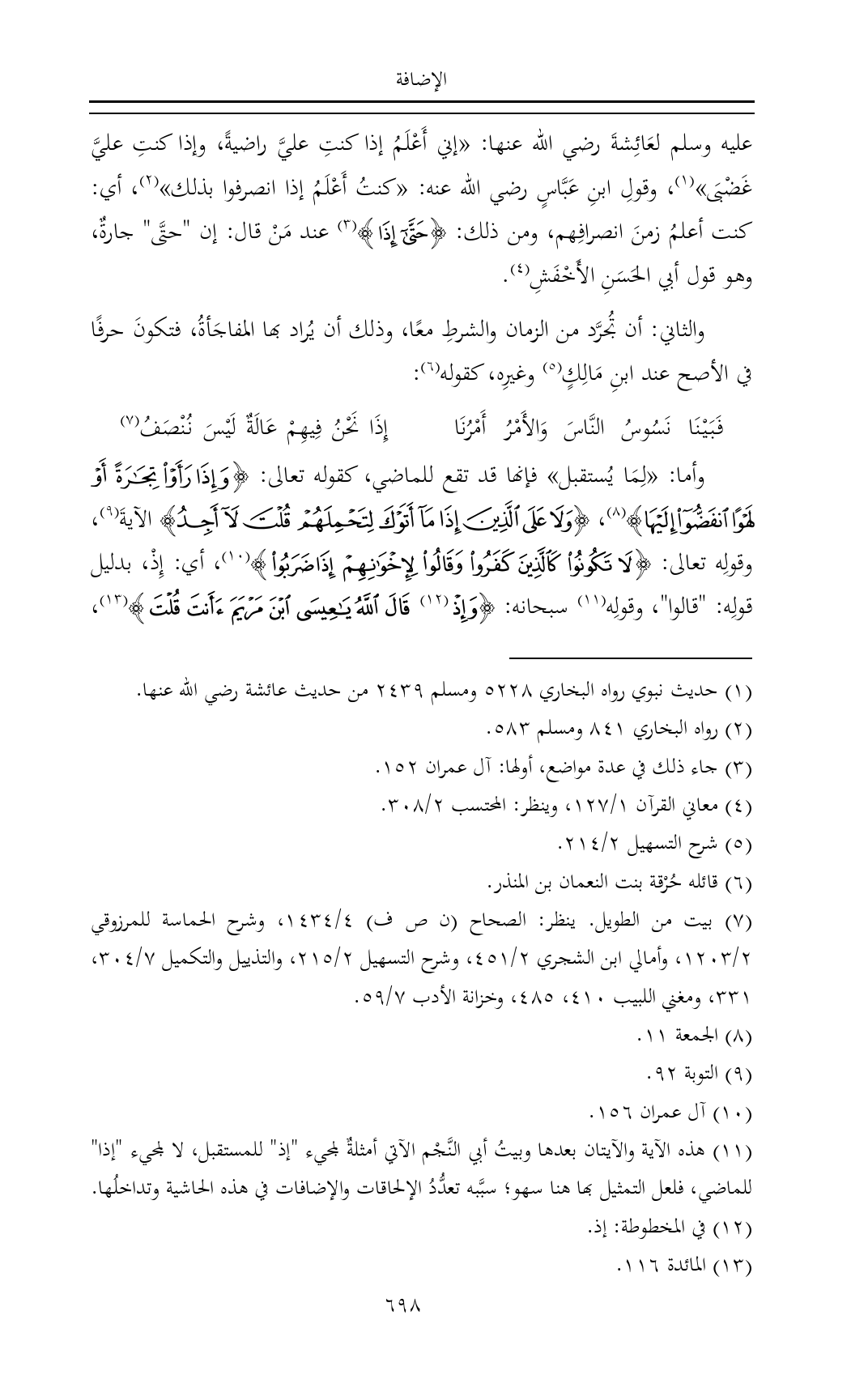 (¬١١) هذه الآية والآيتان بعدها وبيتُ أبي النَّجْم الآتي أمثلةٌ لمجيء "إذ" للمستقبل، لا لمجيء "إذا" للماضي، فلعل التمثيل بها هنا سهو؛ سبَّبه تعدُّدُ الإلحاقات والإضافات في هذه الحاشية وتداخلُها.
