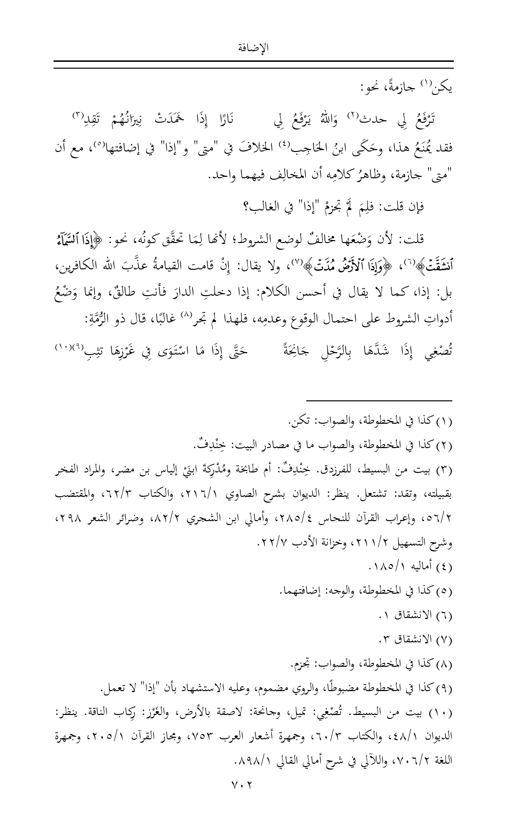 (¬٩) كذا في المخطوطة مضبوطًا، والروي مضموم، وعليه الاستشهاد بأن "إذا" لا تعمل.