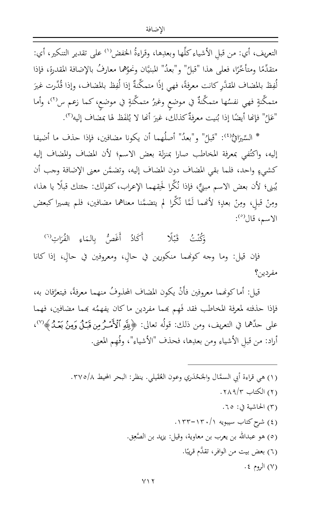 قيل: أما كونهما معروفين فأَنْ يكون المضاف المحذوفُ منهما معرفةً، فيتعرَّفان به، فإذا حذفته لمعرفة المخاطب فقد فَهِم بهما مفردين ما كان يفهمُه بهما مضافين، فهما على حدِّهما في التعريف، ومن ذلك: قولُه تعالى: {لِلَّهِ الْأَمْرُ مِنْ قَبْلُ وَمِنْ بَعْدُ} (¬٧)، أراد: من قبلِ الأشياء ومن بعدِها، فحذف "الأشياء"، وفُهِم المعنى.