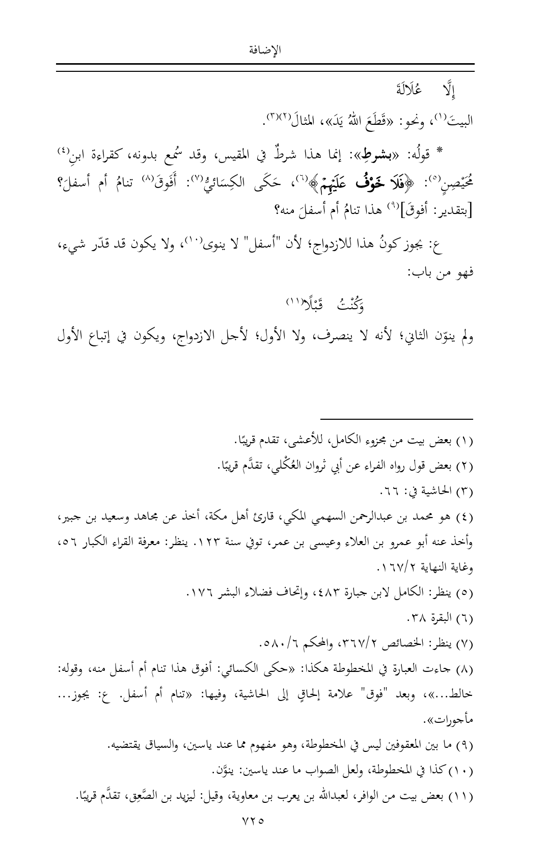 * قولُه: «بشرطِ»: إنما هذا شرطٌ في المقيس، وقد سُمع بدونه، كقراءة ابنِ (¬٤) مُحَيْصِنٍ (¬٥): {فَلَا خَوْفُ عَلَيْهِمْ} (¬٦)، حَكَى الكِسَائيُّ (¬٧): أَفَوقَ (¬٨) تنامُ أم أسفلَ؟ [بتقدير: أفوقَ] (¬٩) هذا تنامُ أم أسفلَ منه؟