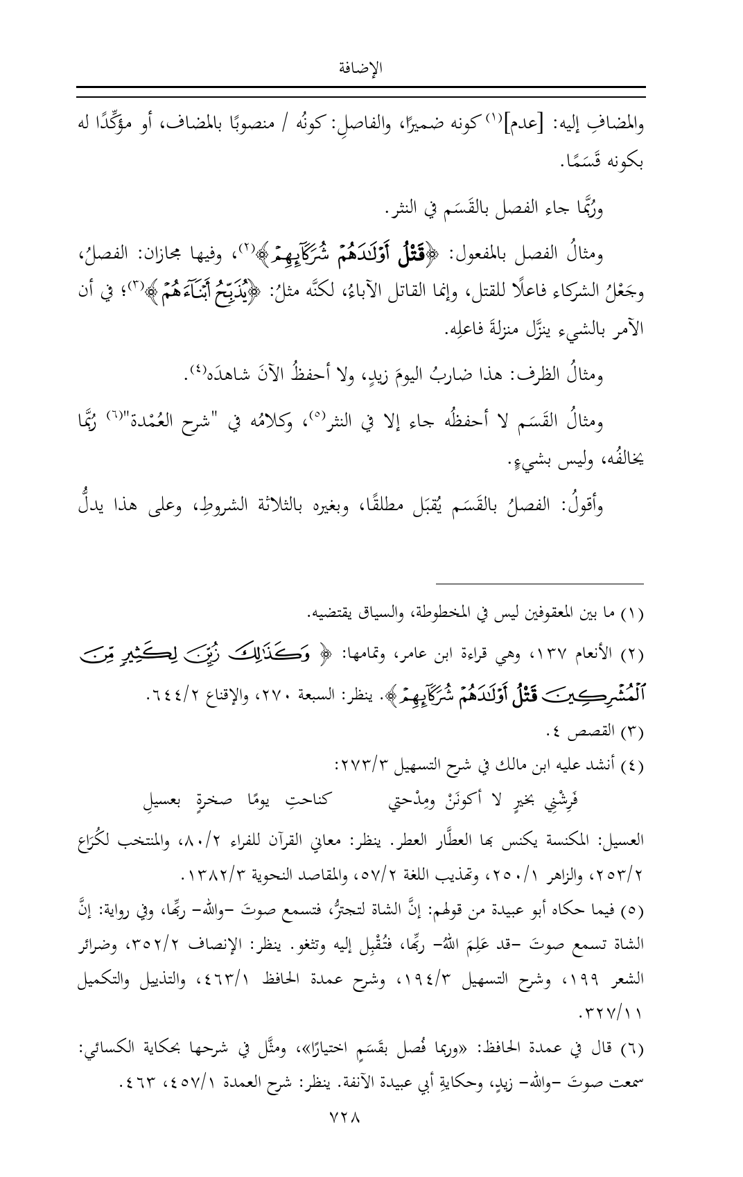 (¬٦) قال في عمدة الحافظ: «وربما فُصل بقَسَمٍ اختيارًا»، ومثَّل في شرحها بحكاية الكسائي: سمعت صوتَ -والله- زيدٍ، وحكايةِ أبي عبيدة الآنفة. ينظر: شرح العمدة ١/ ٤٥٧، ٤٦٣.