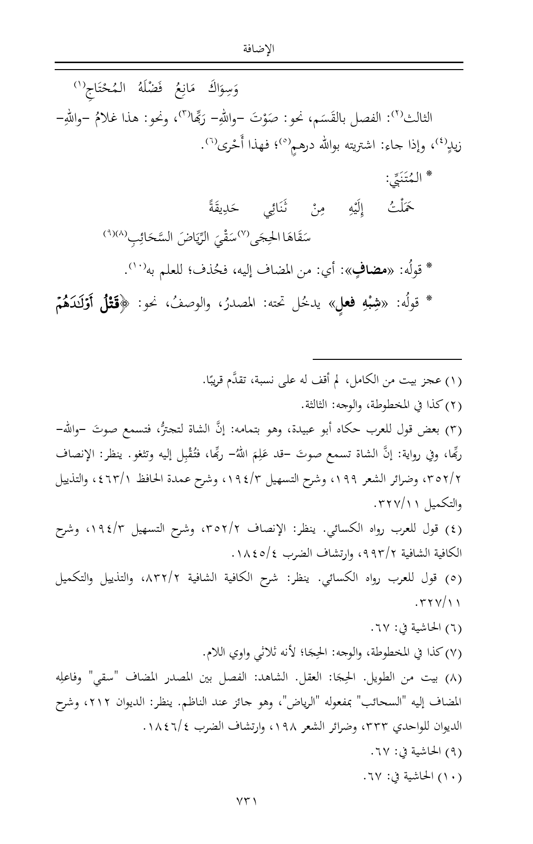 (¬٨) بيت من الطويل. الحِجَا: العقل. الشاهد: الفصل بين المصدر المضاف "سقي" وفاعلِه المضاف إليه "السحائب" بمفعوله "الرياض"، وهو جائز عند الناظم. ينظر: الديوان ٢١٢، وشرح الديوان للواحدي ٣٣٣، وضرائر الشعر ١٩٨، وارتشاف الضرب ٤/ ١٨٤٦.