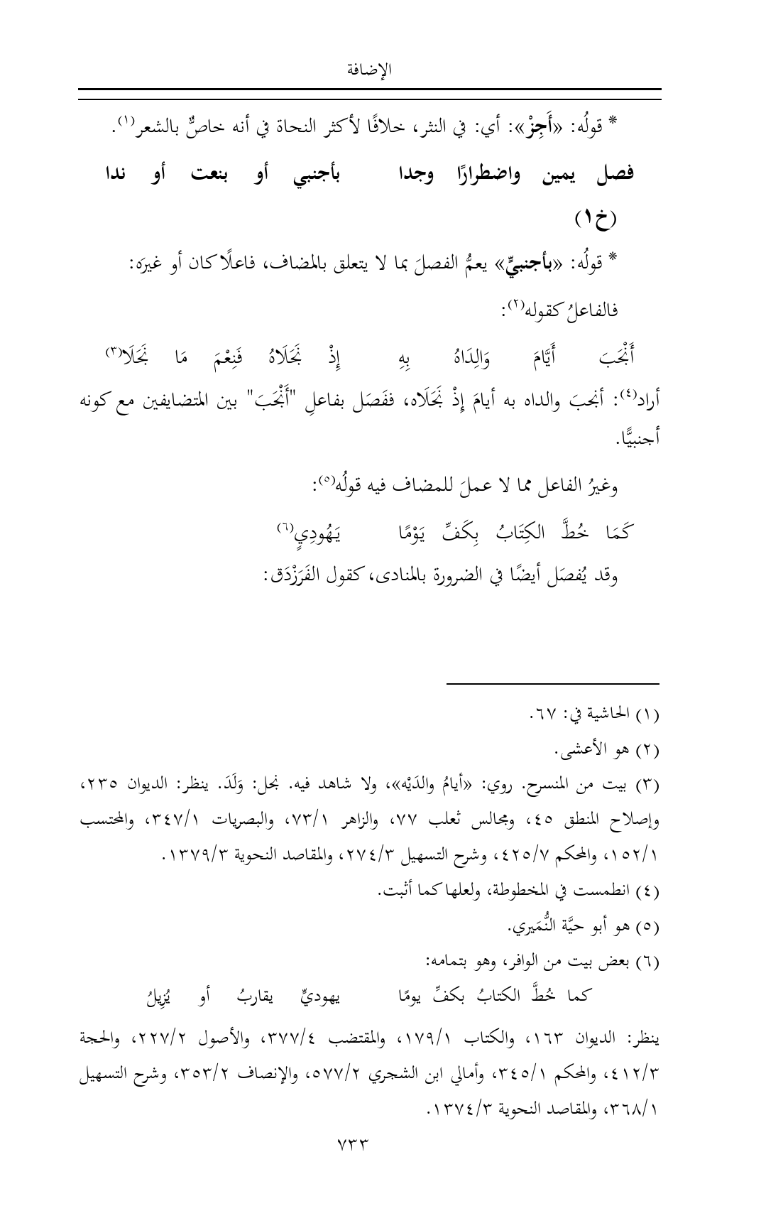 * قولُه: «بأجنبيٍّ» يعمُّ الفصلَ بما لا يتعلق بالمضاف، فاعلًا كان أو غيرَه: