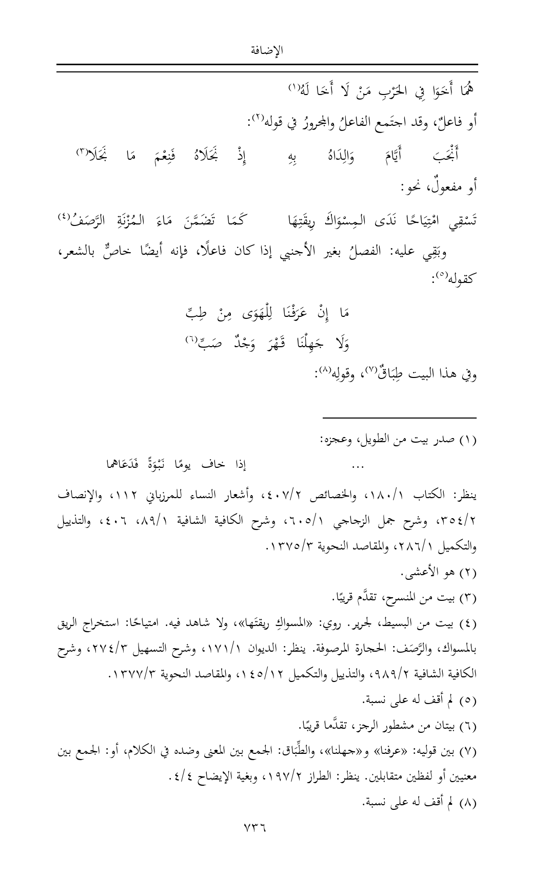 (¬٤) بيت من البسيط، لجرير. روي: «المسواكِ ريقتَها»، ولا شاهد فيه. امتياحًا: استخراج الريق بالمسواك، والرَّصَف: الحجارة المرصوفة. ينظر: الديوان ١/ ١٧١، وشرح التسهيل ٣/ ٢٧٤، وشرح الكافية الشافية ٢/ ٩٨٩، والتذييل والتكميل ١٢/ ١٤٥، والمقاصد النحوية ٣/ ١٣٧٧.