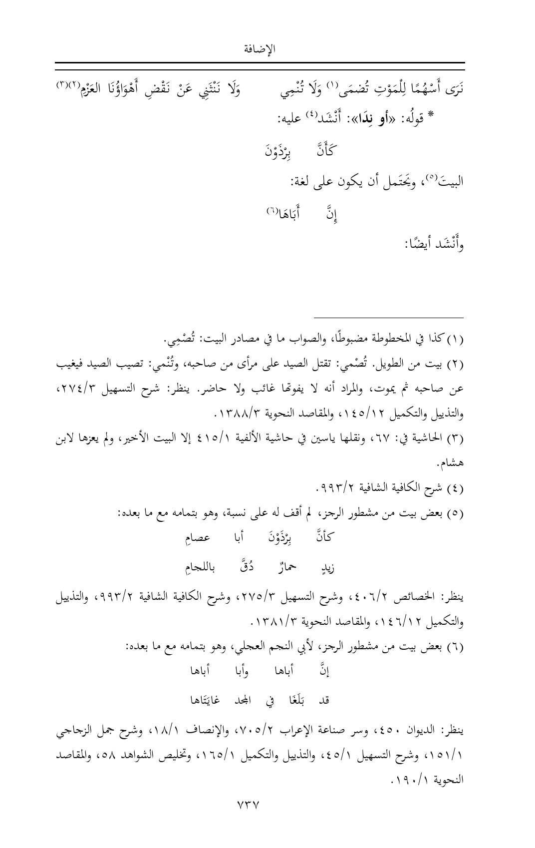 ينظر: الخصائص ٢/ ٤٠٦، وشرح التسهيل ٣/ ٢٧٥، وشرح الكافية الشافية ٢/ ٩٩٣، والتذييل والتكميل ١٢/ ١٤٦، والمقاصد النحوية ٣/ ١٣٨١.