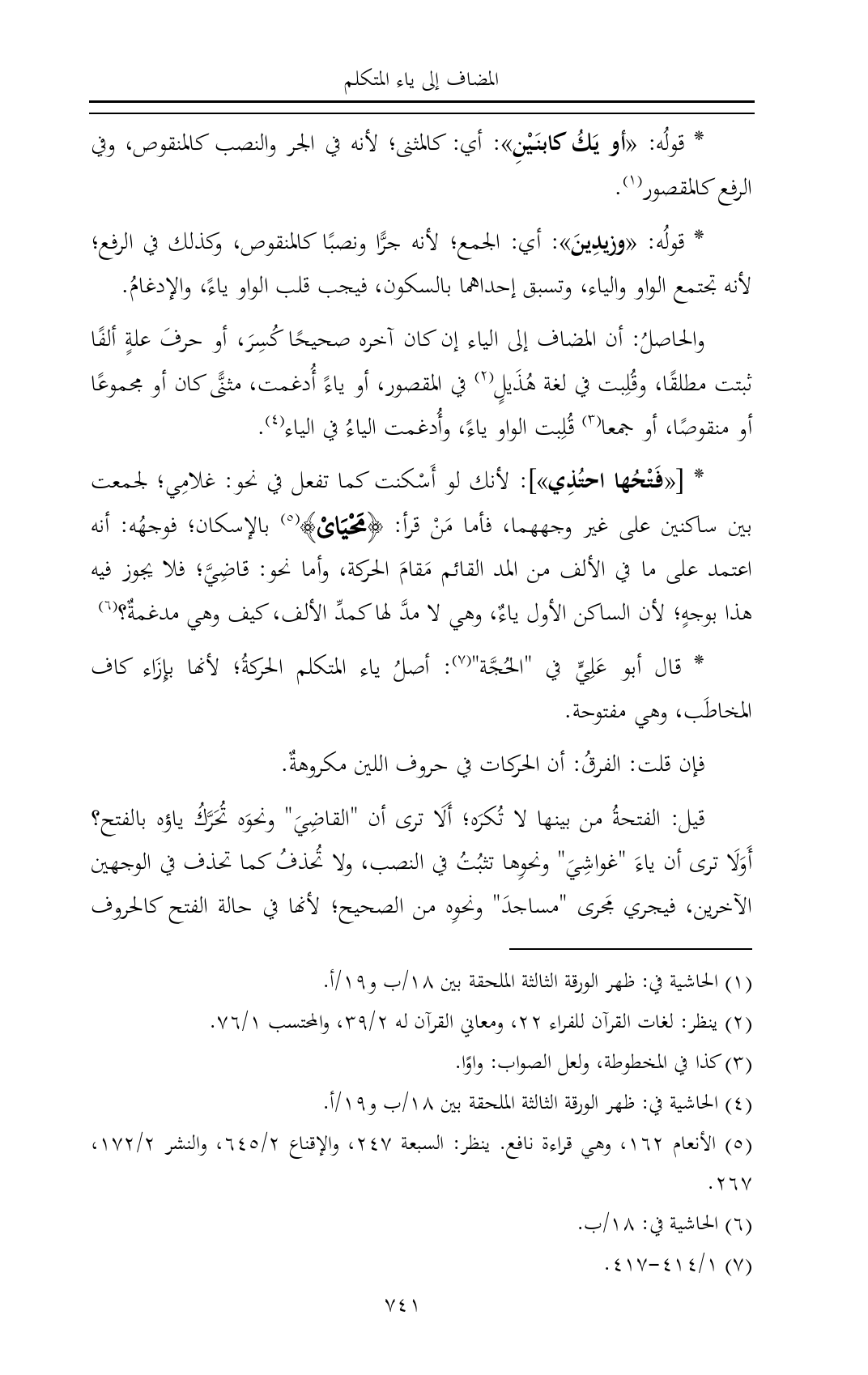 * [«فَتْحُها احتُذِي»]: لأنك لو أَسْكنت كما تفعل في نحو: غلامِي؛ لجمعت بين ساكنين على غير وجههما، فأما مَنْ قرأ: {مَحْيَايْ} (¬٥) بالإسكان؛ فوجهُه: أنه اعتمد على ما في الألف من المد القائم مَقامَ الحركة، وأما نحو: قاضِيَّ؛ فلا يجوز فيه هذا بوجهٍ؛ لأن الساكن الأول ياءٌ، وهي لا مدَّ لها كمدِّ الألف، كيف وهي مدغمةٌ؟ (¬٦)