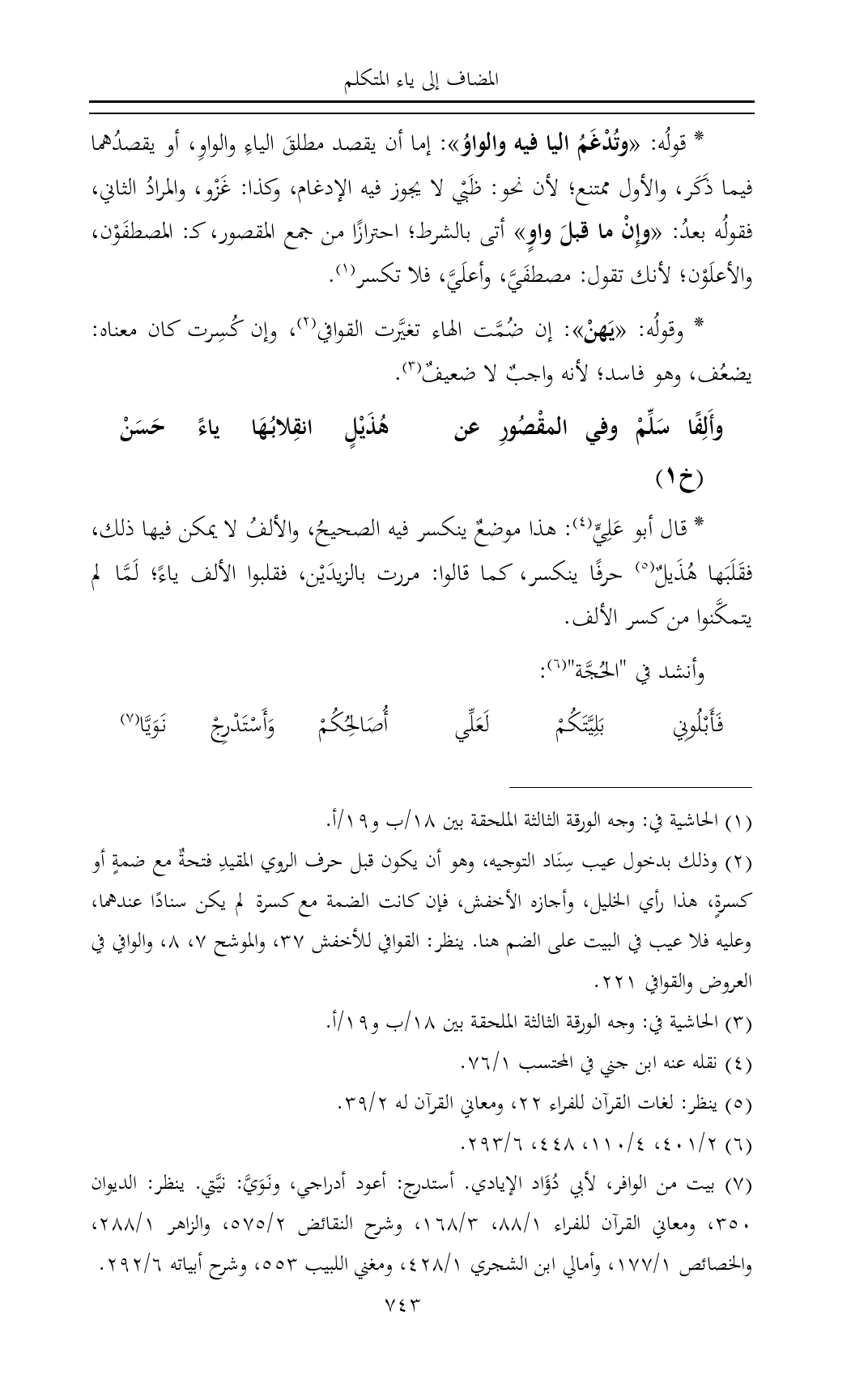 * قولُه: «وتُدْغَمُ اليا فيه والواوُ»: إما أن يقصد مطلقَ الياءِ والواوِ، أو يقصدُهما فيما ذَكَر، والأول ممتنع؛ لأن نحو: ظَبْي لا يجوز فيه الإدغام، وكذا: غَزْو، والمرادُ الثاني، فقولُه بعدُ: «وإِنْ ما قبلَ واوٍ» أتى بالشرط؛ احترازًا من جمع المقصور، كـ: المصطفَوْن، والأعلَوْن؛ لأنك تقول: مصطفَيَّ، وأعلَيَّ، فلا تكسر (¬١).