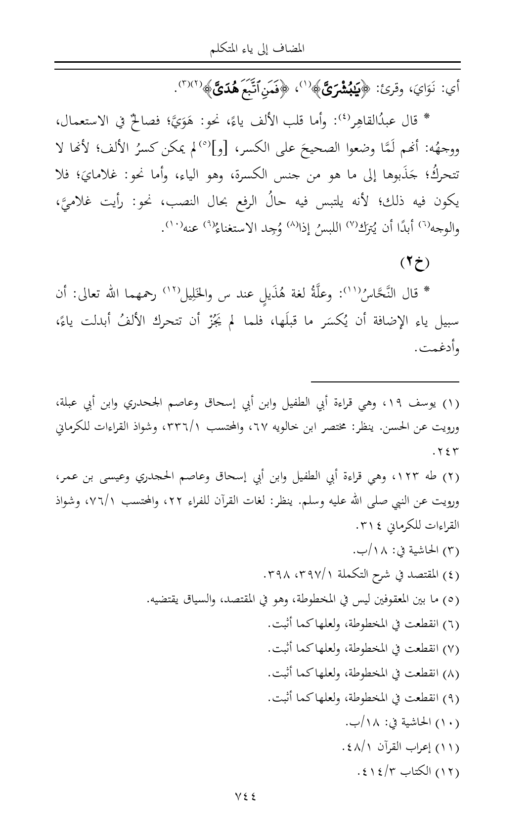 * قال النَّحَّاسُ (¬١١): وعلَّةُ لغة هُذَيلٍ عند س والخَلِيل (¬١٢) رحمهما الله تعالى: أن سبيل ياء الإضافة أن يُكسَر ما قبلَها، فلما لم يَجُزْ أن تتحرك الألفُ أبدلت ياءً، وأدغمت.