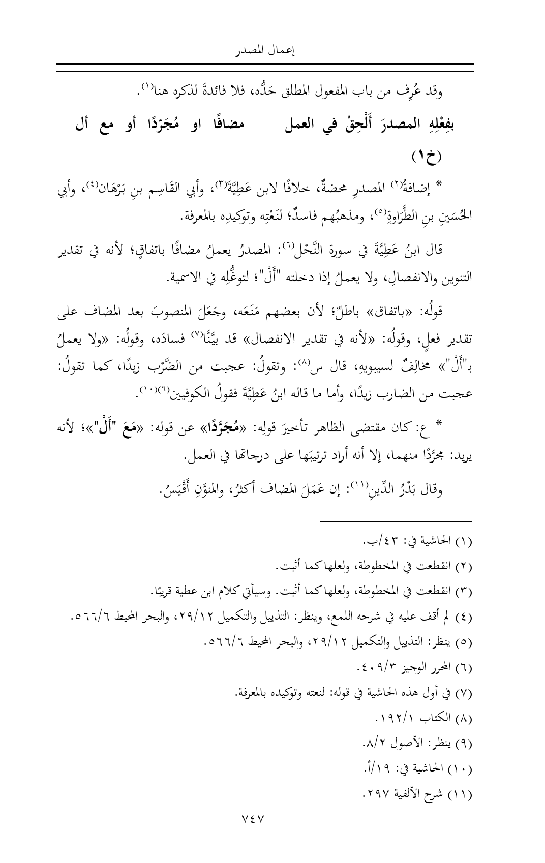 قال ابنُ عَطِيَّةَ في سورة النَّحْل (¬٦): المصدرُ يعملُ مضافًا باتفاقٍ؛ لأنه في تقدير التنوين والانفصالِ، ولا يعملُ إذا دخلته "أَلْ"؛ لتوغُّلِه في الاسمية.