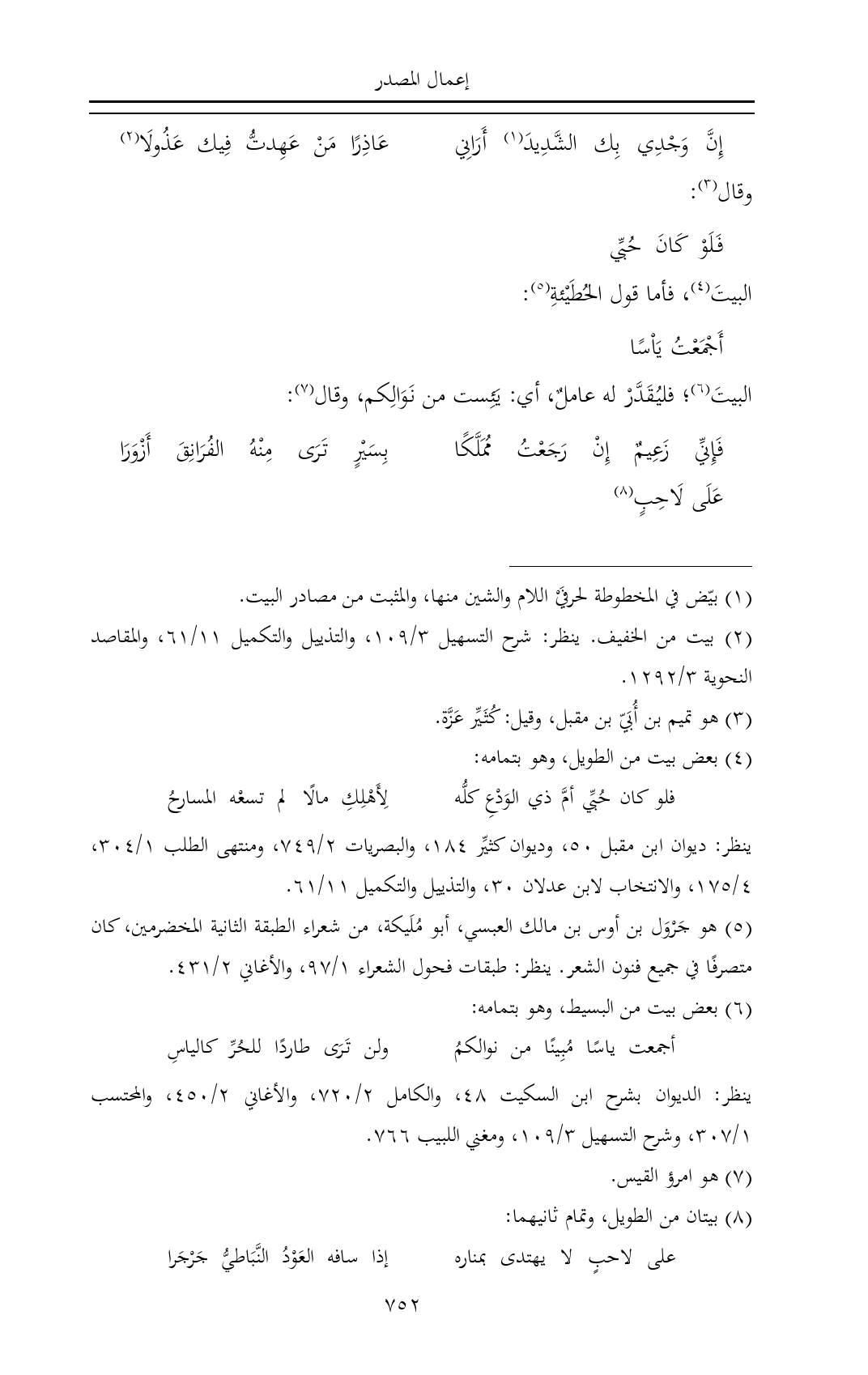 ينظر: الديوان بشرح ابن السكيت ٤٨، والكامل ٢/ ٧٢٠، والأغاني ٢/ ٤٥٠، والمحتسب ١/ ٣٠٧، وشرح التسهيل ٣/ ١٠٩، ومغني اللبيب ٧٦٦.