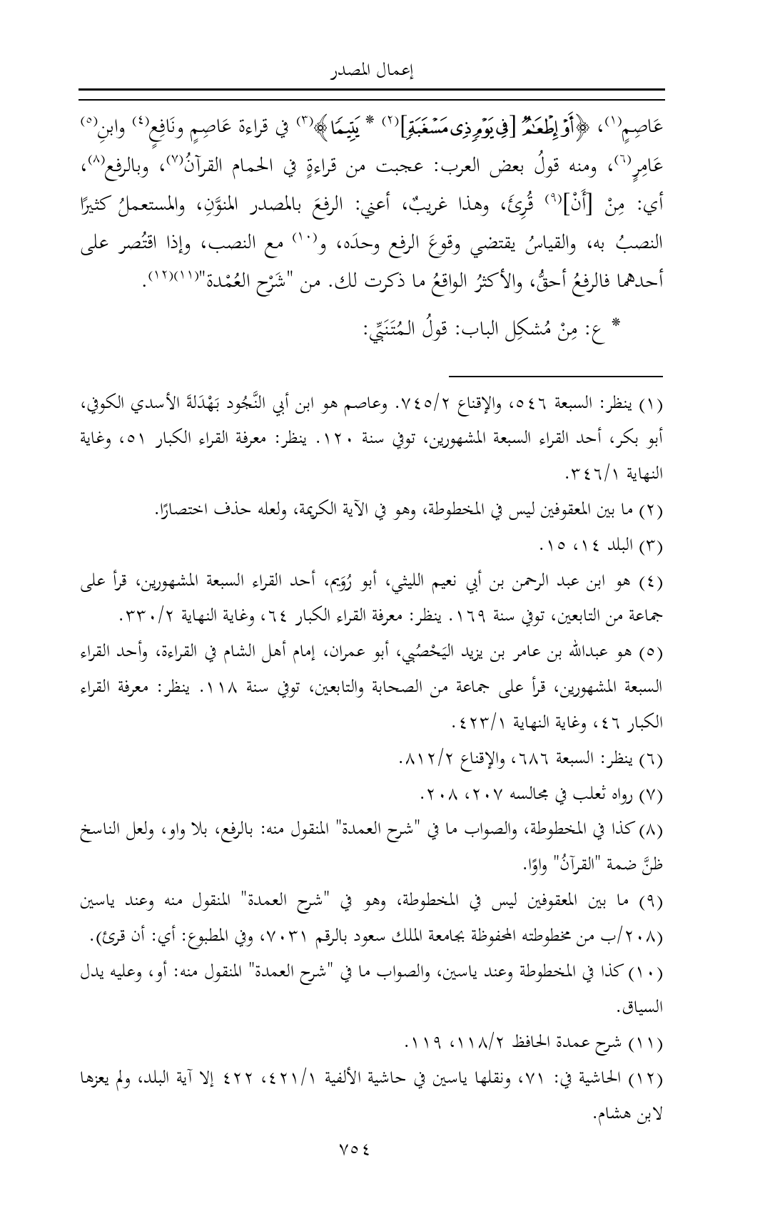 عَاصِمٍ (¬١)، {أَوْ إِطْعَامٌ [فِي يَوْمٍ ذِي مَسْغَبَةٍ] (¬٢) * يَتِيمًا} (¬٣) في قراءة عَاصِمٍ ونَافِعٍ (¬٤) وابنِ (¬٥) عَامِرٍ (¬٦)، ومنه قولُ بعض العرب: عجبت من قراءةٍ في الحمام القرآنُ (¬٧)، وبالرفع (¬٨)،