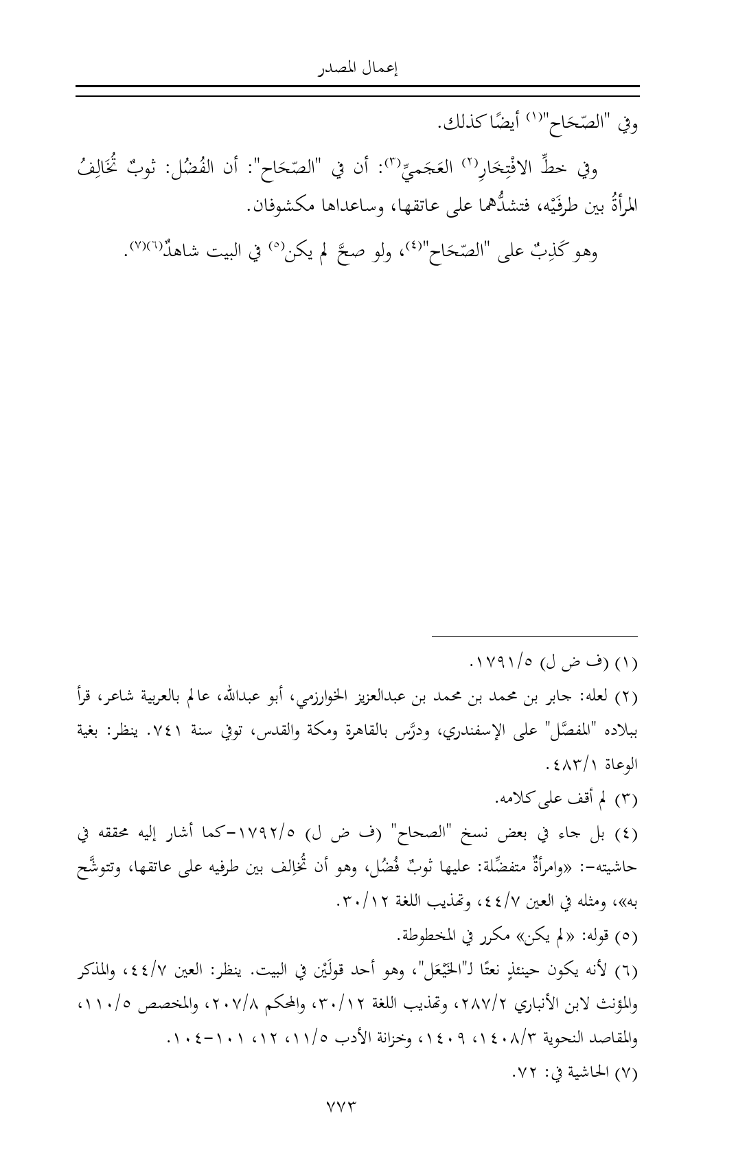 (¬٤) بل جاء في بعض نسخ "الصحاح" (ف ض ل) ٥/ ١٧٩٢ - كما أشار إليه محققه في حاشيته-: «وامرأةٌ متفضِّلة: عليها ثوبٌ فُضُل، وهو أن تُخاِلف بين طرفيه على عاتقها، وتتوشَّح به»، ومثله في العين ٧/ ٤٤، وتهذيب اللغة ١٢/ ٣٠.