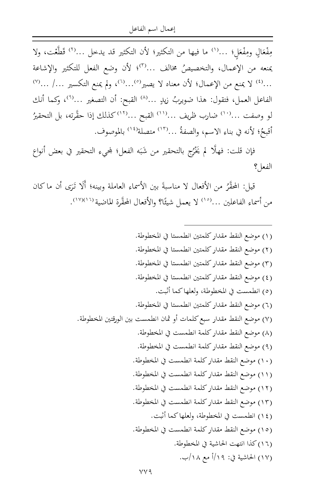 مِفْعَالٍ ومِفْعَلٍ؛ ... (¬١) ما فيها من التكثير؛ لأن التكثير قد يدخل ... (¬٢) قَطَّعْت، ولا يمنعه من الإعمال، والتخصيصُ مخالف ... (¬٣)؛ لأن وضع الفعل للتكثير والإشاعة ... (¬٤) لا يمنع من الإعمال؛ لأن معناه لا يصير (¬٥) ... (¬٦)، ولم يمنع التكسير ... / ... (¬٧) الفاعل العمل، فتقول: هذا ضويربُ زيدٍ ... (¬٨) القبح: أن التصغير ... (¬٩)، وكما أنك لو وصفت ... (¬١٠) ضارب ظريف ... (¬١١) القبح ... (¬١٢) كذلك إذا حقَّرته، بل التحقيرُ أقبحُ؛ لأنه في بناء الاسم، والصفةُ ... (¬١٣) متصلة (¬١٤) بالموصوف.