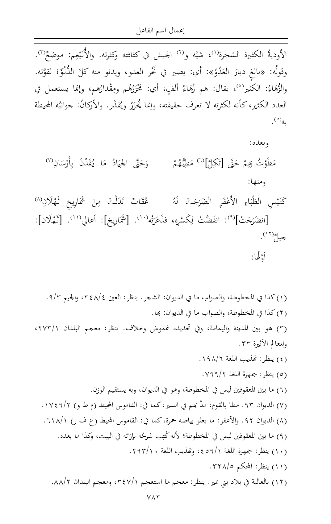 الأوديةُ الكثيرة الشجرة (¬١)، شبَّه و (¬٢) الجيش في كثافته وكثرته. والأُنَيْعِم: موضعٌ (¬٣). وقولُه: «بالغٍ ديارَ العَدُوِّ»: أي: يصير في نَحْر العدو، ويدنو منه كلَّ الدُّنُوِّ؛ لقوَّته. والزُّهَاءُ: الكثير (¬٤)، يقال: هم زُهَاءُ ألفٍ، أي: مَحْزَرُهُم ومِقْدارُهم، وإنما يستعمل في العدد الكثير، كأنه لكثرته لا تعرف حقيقته، وإنما يُحزَرُ ويُقدَّر. والأركانُ: جوانبُه المحيطة به (¬٥).