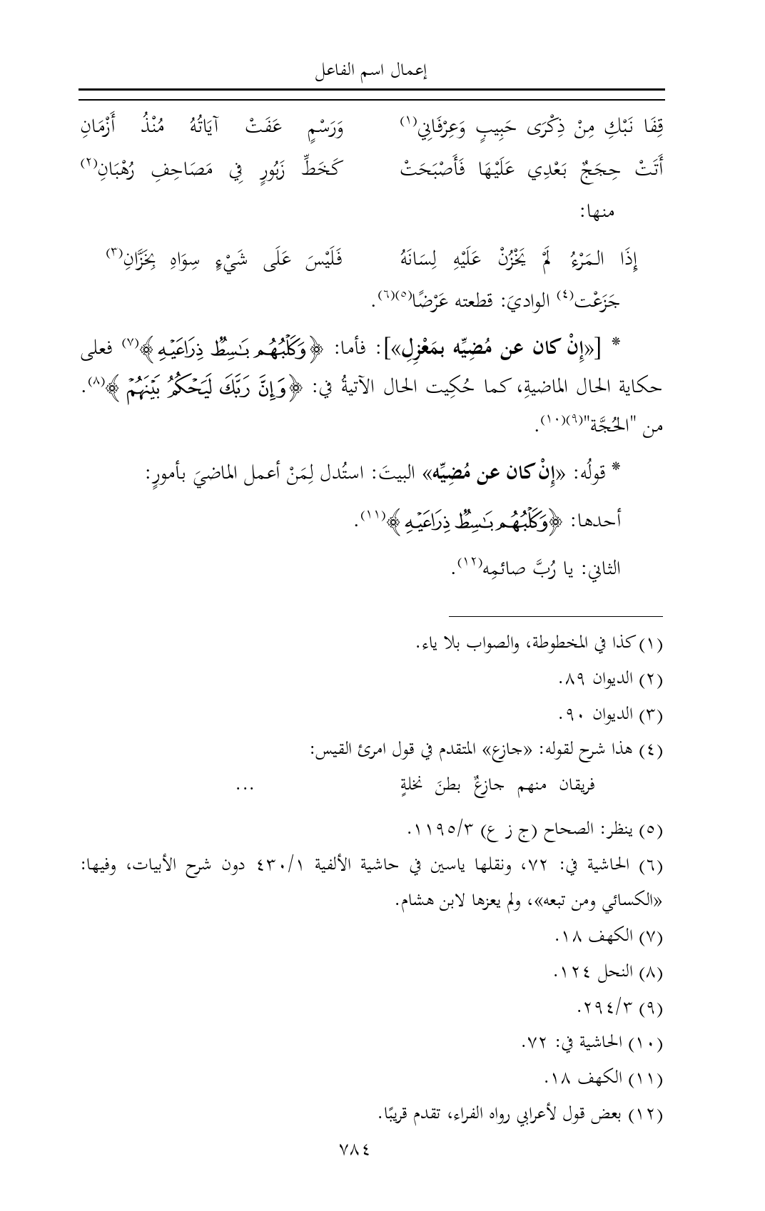 * [«إِنْ كان عن مُضِيِّه بمَعْزِلِ»]: فأما: {وَكَلْبُهُمْ بَاسِطٌ ذِرَاعَيْهِ} (¬٧) فعلى حكاية الحال الماضيةِ، كما حُكِيت الحال الآتيةُ في: {وَإِنَّ رَبَّكَ لَيَحْكُمُ بَيْنَهُمْ} (¬٨). من "الحُجَّة" (¬٩) (¬١٠).