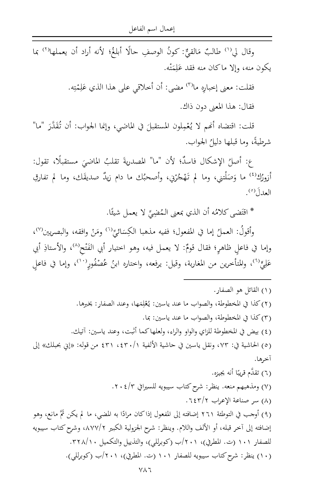 ع: أصلُ الإشكال فاسدٌ؛ لأن "ما" المصدريةَ تقلبُ الماضيَ مستقبلًا، تقول: أزورُك (¬٤) ما وَصَلْتني، وما لم تَهْجُرْني، وأصحبُك ما دام زيدٌ صديقَك، وما لم تفارقِ العدلَ (¬٥).
