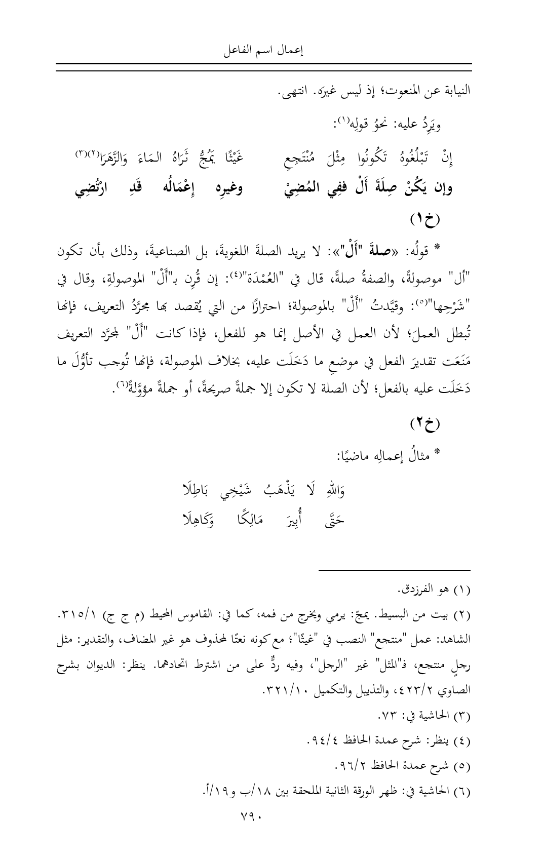 * قولُه: «صلةَ "أَلْ"»: لا يريد الصلةَ اللغويةَ، بل الصناعيةَ، وذلك بأن تكون "أل" موصولةً، والصفةُ صلةً، قال في "العُمْدَة" (¬٤): إن قُرِن بـ"أَلْ" الموصولةِ، وقال في "شَرْحِها" (¬٥): وقيَّدتُ "أَلْ" بالموصولة؛ احترازًا من التي يُقصد بها مجرَّدُ التعريف، فإنها تُبطل العملَ؛ لأن العمل في الأصل إنما هو للفعل، فإذا كانت "أَلْ" لمجرَّد التعريف مَنَعَت تقديرَ الفعل في موضعِ ما دَخَلَت عليه، بخلاف الموصولة، فإنها تُوجب تأوُّلَ ما دَخَلَت عليه بالفعل؛ لأن الصلة لا تكون إلا جملةً صريحةً، أو جملةً مؤوَّلةً (¬٦).