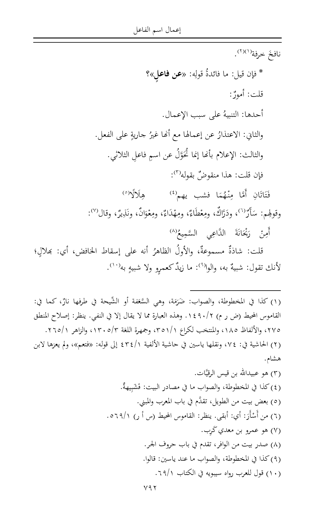 قلت: شاذةٌ مسموعةٌ، والأولُ الظاهرُ أنه على إسقاط الخافض، أي: بهلالٍ؛ لأنك تقول: شبيهٌ به، والوا (¬٩): ما زيدٌ كعمرٍو ولا شبيهٍ به (¬١٠).