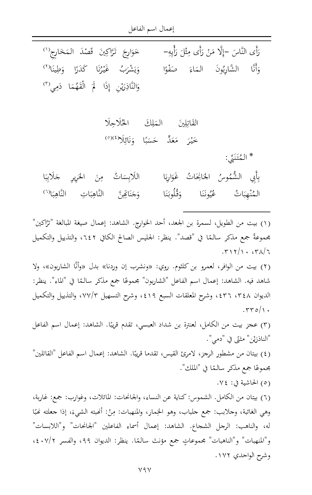 (¬٦) بيتان من الكامل. الشموس: كناية عن النساء، والجانحات: المائلات، وغوارب: جمع: غاربة، وهي الغائبة، وجلابب: جمع جلباب، وهو الخِمار، والمنهبات: مِنْ: أنهبته الشيءَ، إذا جعلته نهبًا له، والناهب: الرجل الشجاع. الشاهد: إعمال أسماء الفاعلين "الجانحات" و"اللابسات" و"المنهبات" و"الناهبات" مجموعاتٍ جمع مؤنث سالمًا. ينظر: الديوان ٩٩، والفسر ٢/ ٤٠٧، وشرح الواحدي ١٧٢.