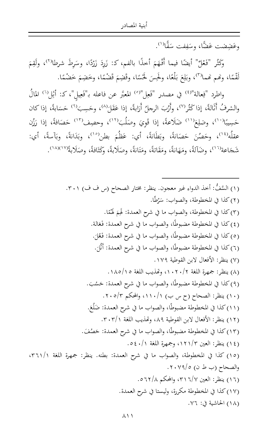 واطرد "فِعالة" (¬٤) في مصدر "فَعِل" (¬٥) المعبَّر عن فاعله بـ"فَعِيلٍ"، كـ: أثِل (¬٦) المالُ والشرفُ أَثَالةً، إذا كَثُر (¬٧)، وأَرُبَ الرجلُ أَرَابةً، إذا عَقَلَ (¬٨)، وحَسِبَ (¬٩) حَسَابةً، إذا كان حَسِيبًا (¬١٠)، وضلِعَ (¬١١) ضَلَاعةً، إذا قَوِيَ وصَلُبَ (¬١٢)، وحصِف (¬١٣) حَصَافةً، إذا رَزُن عقلُه (¬١٤)، وحَصُنَ حَصَانةً، وبَطَانةً، أي: عَظُمَ بطن (¬١٥)، وبَدَانةً، وبَآسةً، أي: شَجَاعة (¬١٦)، وضَآلةً، ومَهَانةً، ومَقَاتةً، ومَتَانةً، وصَلَابةً، وكَثَافةً، وصَلَابةً (¬١٧) (¬١٨).