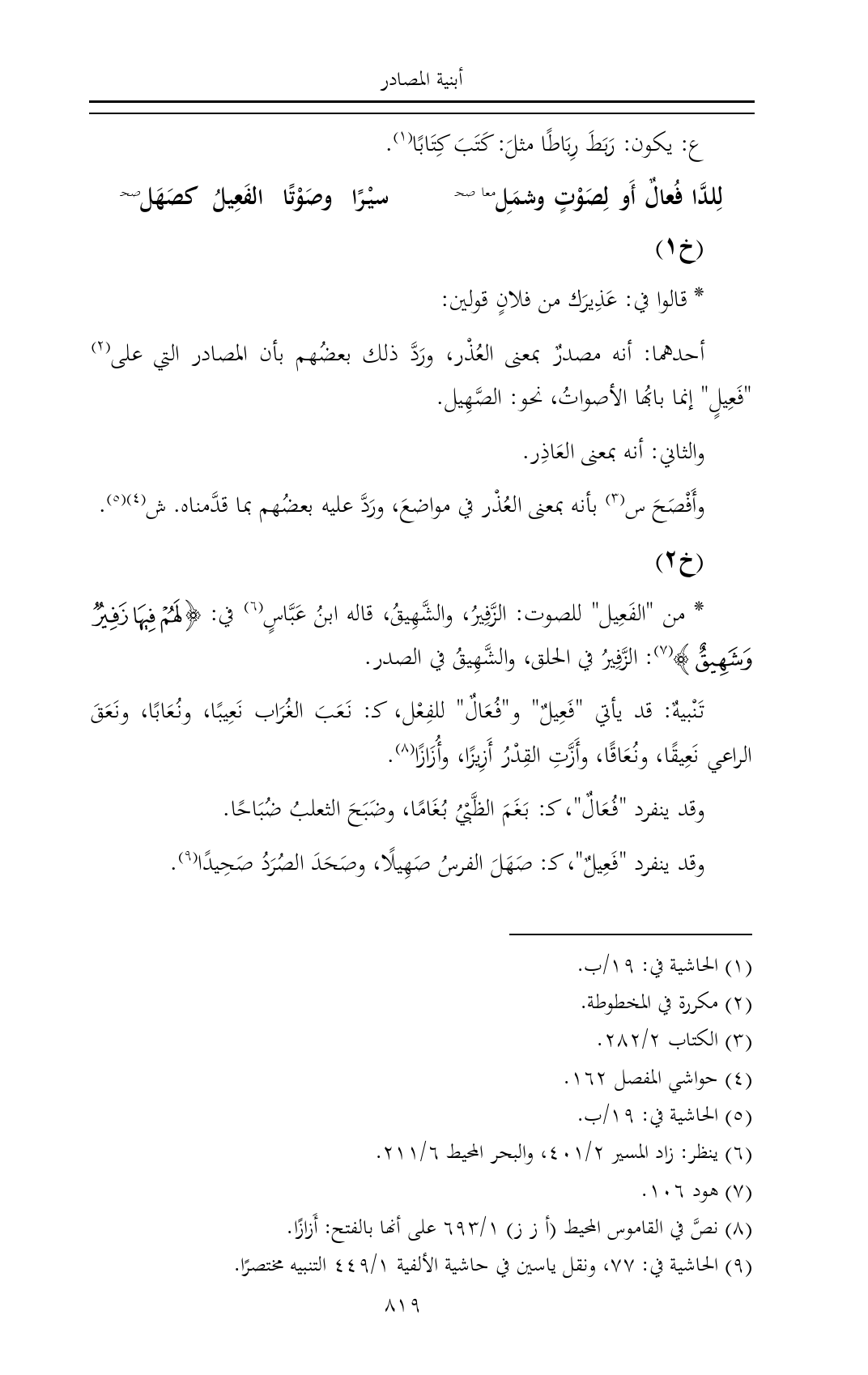 تَنْبيهٌ: قد يأتي "فَعِيلٌ" و"فُعَالٌ" للفِعْل، كـ: نَعَبَ الغُرَاب نَعِيبًا، ونُعَابًا، ونَعَقَ الراعي نَعِيقًا، ونُعَاقًا، وأَزَّتِ القِدْرُ أَزِيزًا، وأُزَازًا (¬٨).