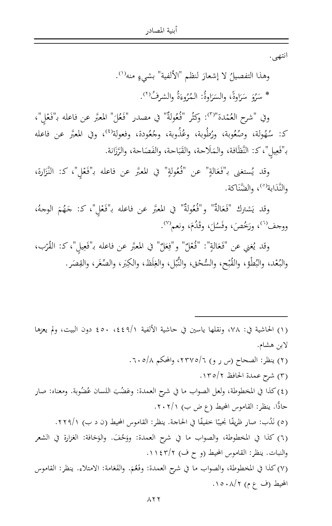 وفي "شرح العُمْدة" (¬٣): وكثُر "فُعُولةٌ" في مصدر "فَعُلَ" المعبَّر عن فاعله بـ"فَعْلٍ"، كـ: سُهُولة، وصُعُوبة، ورُطُوبة، وعُذُوبة، وجُعُودة، وفعولة (¬٤)، وفي المعبَّر عن فاعله بـ"فَعِيلٍ"، كـ: النَّظَافة، والمَلَاحة، والقَبَاحة، والفَصَاحة، والرَّزَانة.