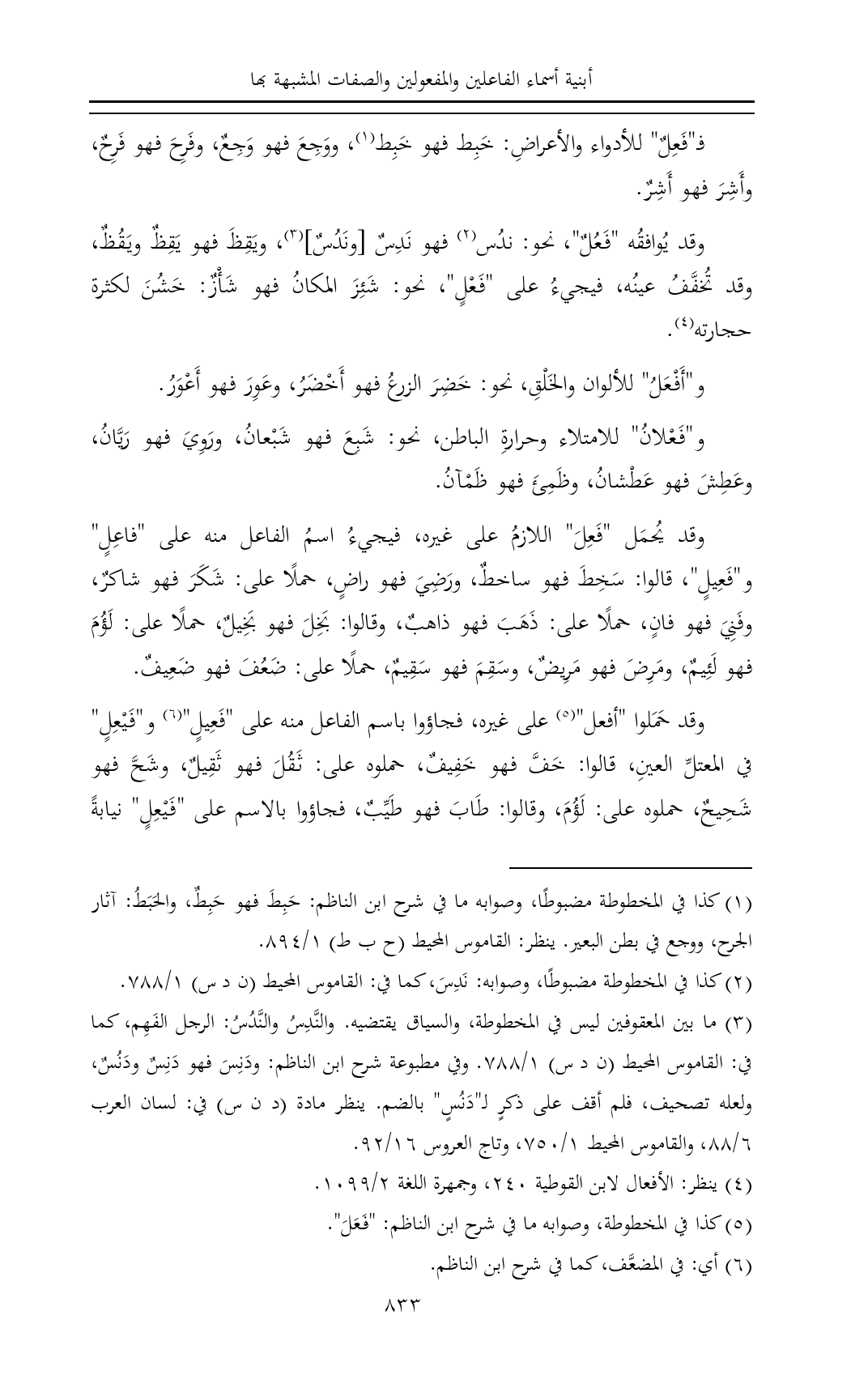 وقد يُوافقُه "فَعُلٌ"، نحو: ندُس (¬٢) فهو نَدِسٌ [ونَدُسٌ] (¬٣)، ويَقِظَ فهو يَقِظٌ ويَقُظٌ، وقد تُخفَّفُ عينُه، فيجيءُ على "فَعْلٍ"، نحو: شَئِزَ المكانُ فهو شَأْزٌ: خَشُنَ لكثرة حجارته (¬٤).